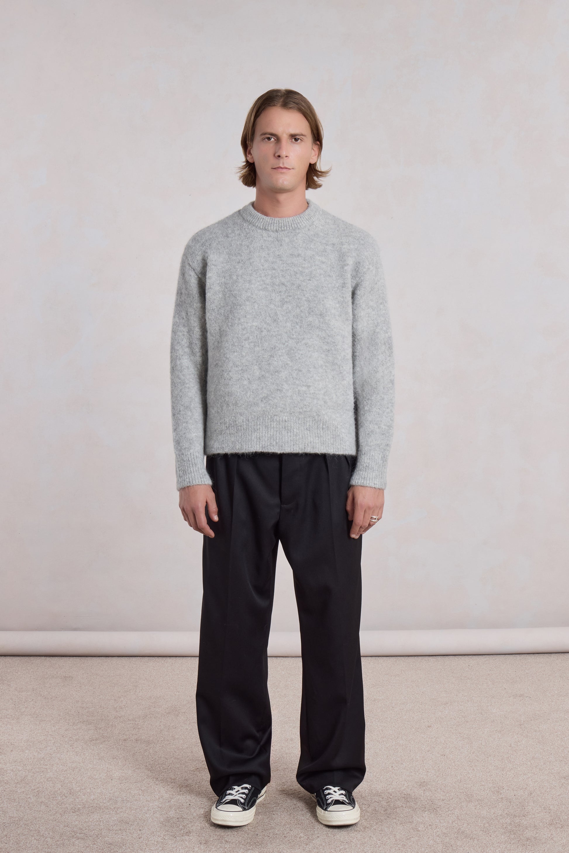 A boxy sweater that highlights the softness of alpaca and exceptional wool density. Knitted in stockinette stitch from Italian yarn composed of 87% baby alpaca—the finest fiber from adult fleece—enriched with polyamide and elastane for durability, it captivates with its fluffy appearance and soft feel.