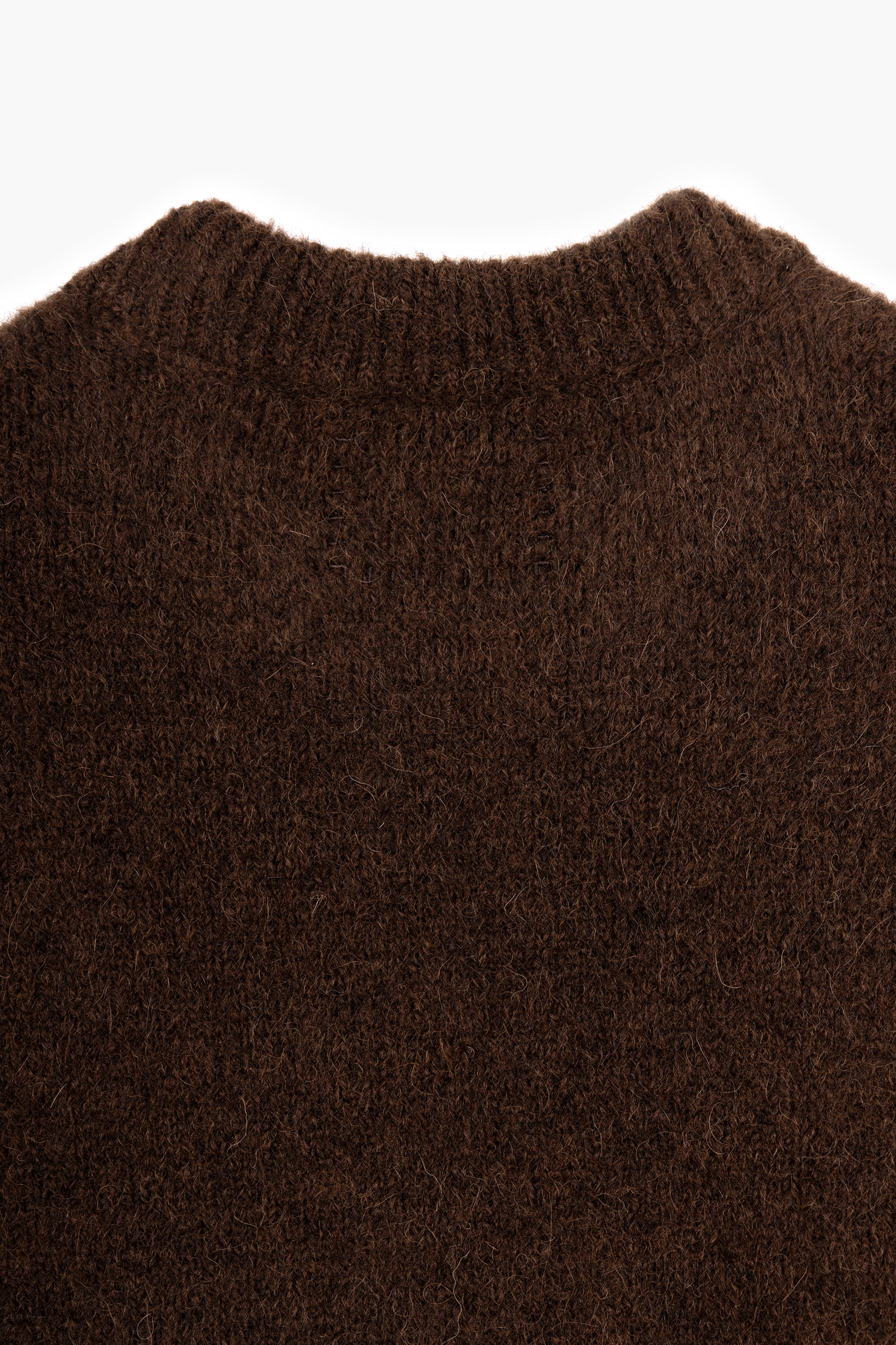 A boxy sweater that highlights the softness of alpaca and exceptional wool density. Knitted in stockinette stitch from Italian yarn composed of 87% baby alpaca—the finest fiber from adult fleece—enriched with polyamide and elastane for durability, it captivates with its fluffy appearance and soft feel.