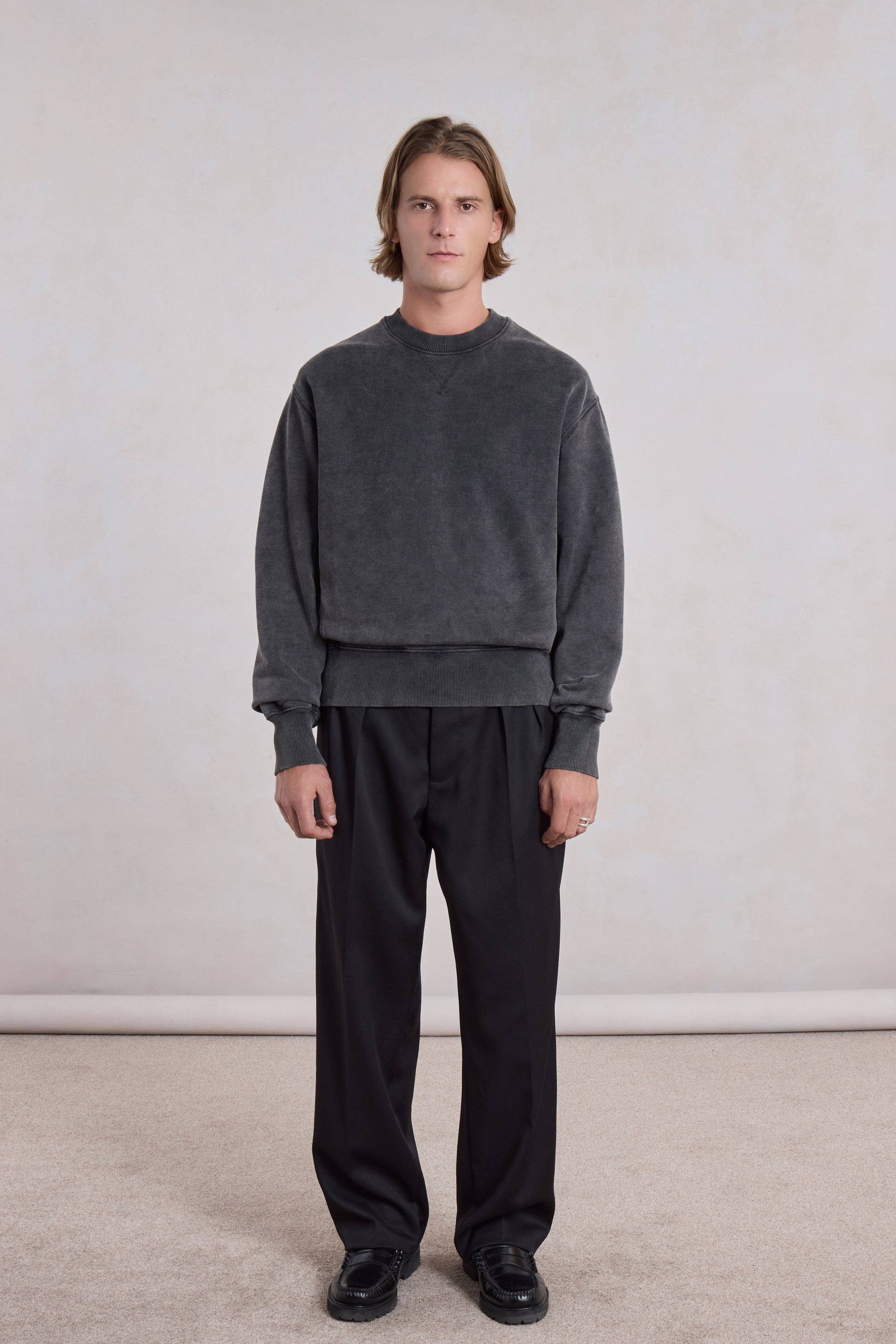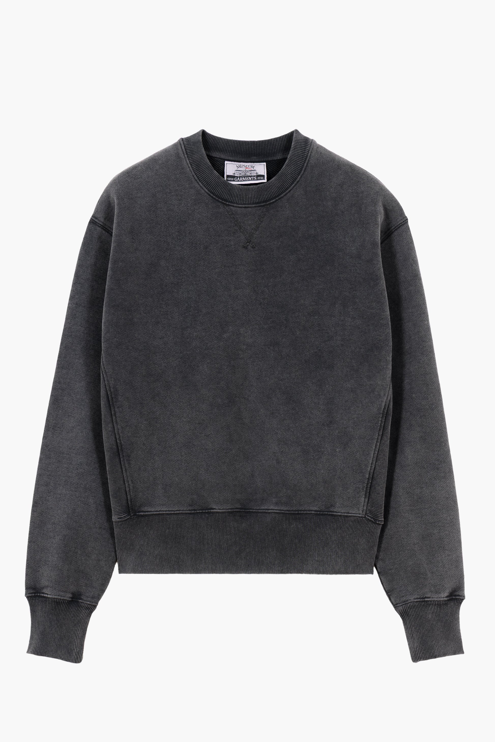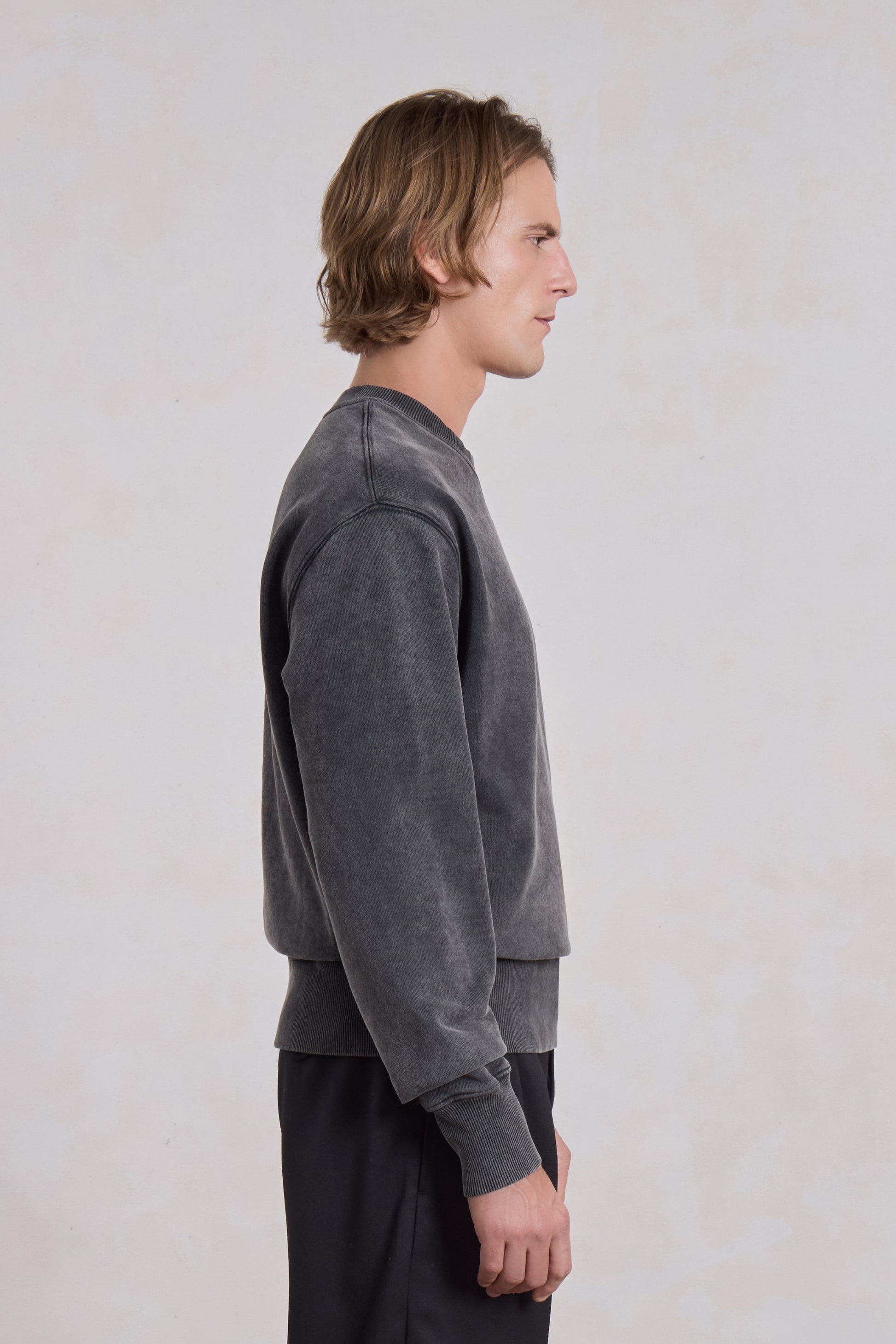 Its wash treatment, achieved through oxidation with a natural abrasive, softens the colors to create an authentic fade-out effect, evoking the subtle patina of vintage sweatshirts. Ribbed detailing at the collar, cuffs, waist, and sides emphasizes its bold look, in line with the college sweatshirts of the 90s.