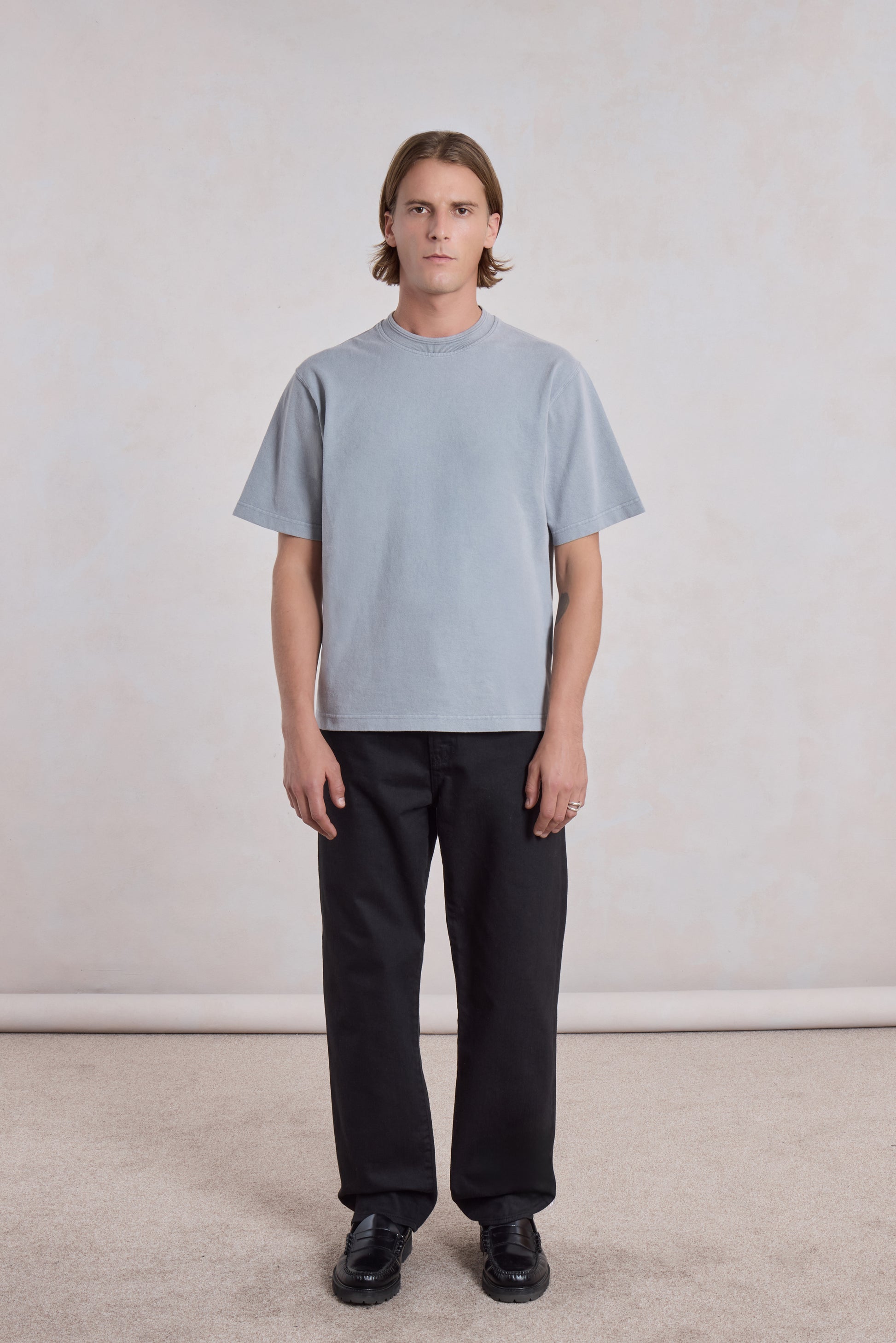 A boxy T-shirt that combines heavyweight fabric with a refined aesthetic. Made from 300 gsm jersey in 100% cotton, 50% of which is recycled, it has a density and structure that reinforce its character.