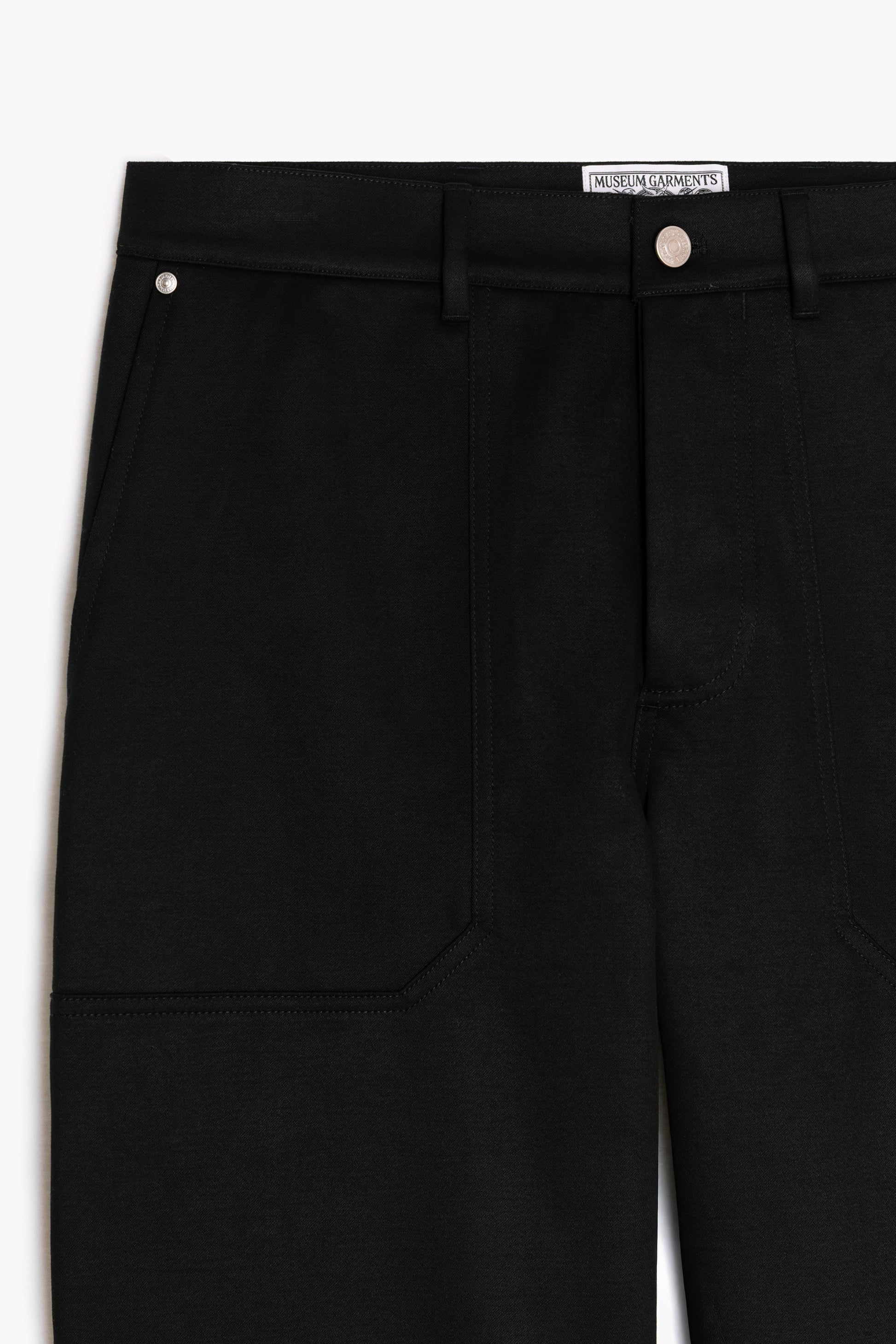 Its wide leg, with a subtly ballooned volume, structures the silhouette while offering natural ease. The inset front pockets, inherited from traditional fatigue pants, the patch back pockets, and the engraved metal rivets highlight its functional dimension.