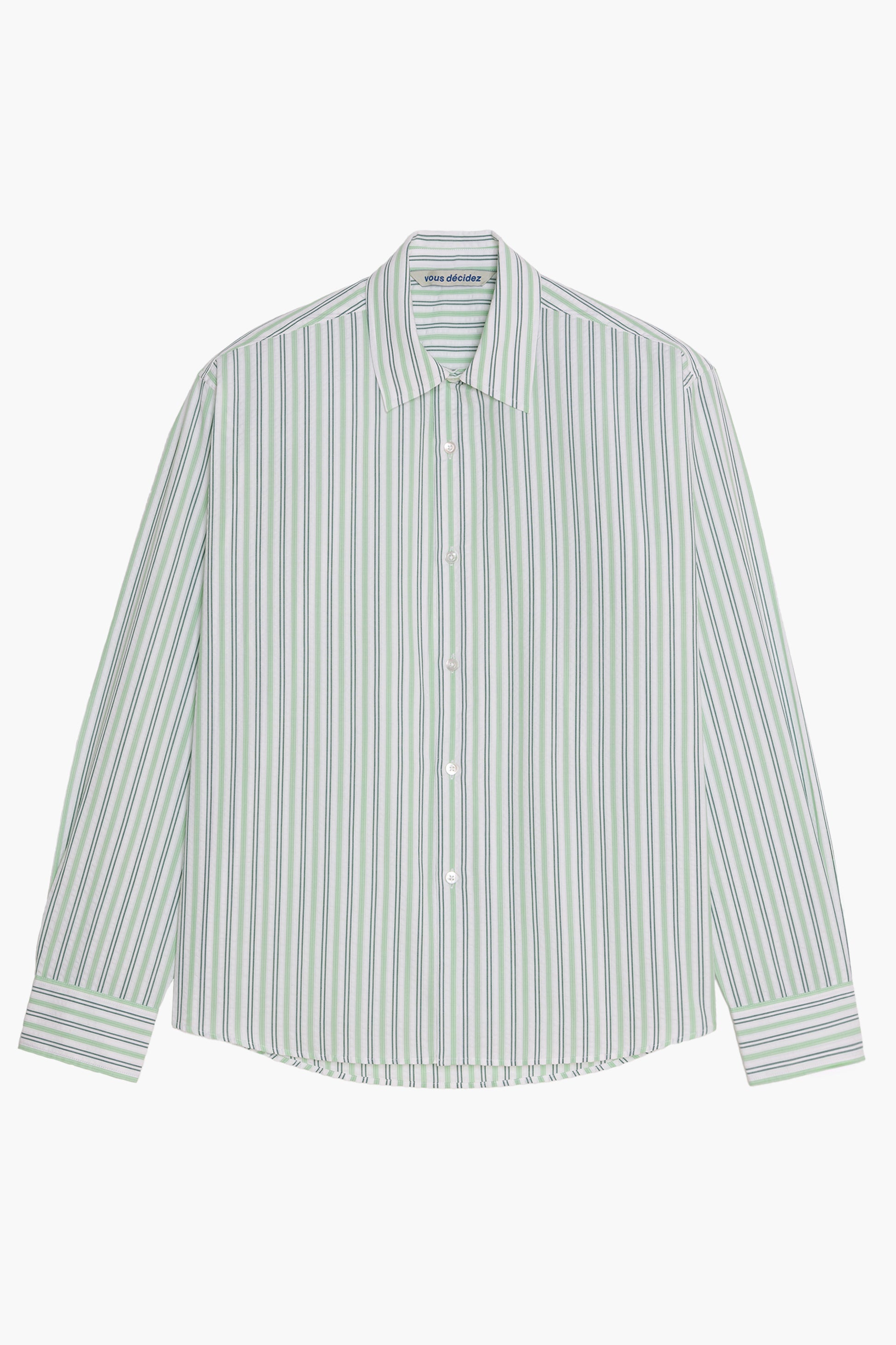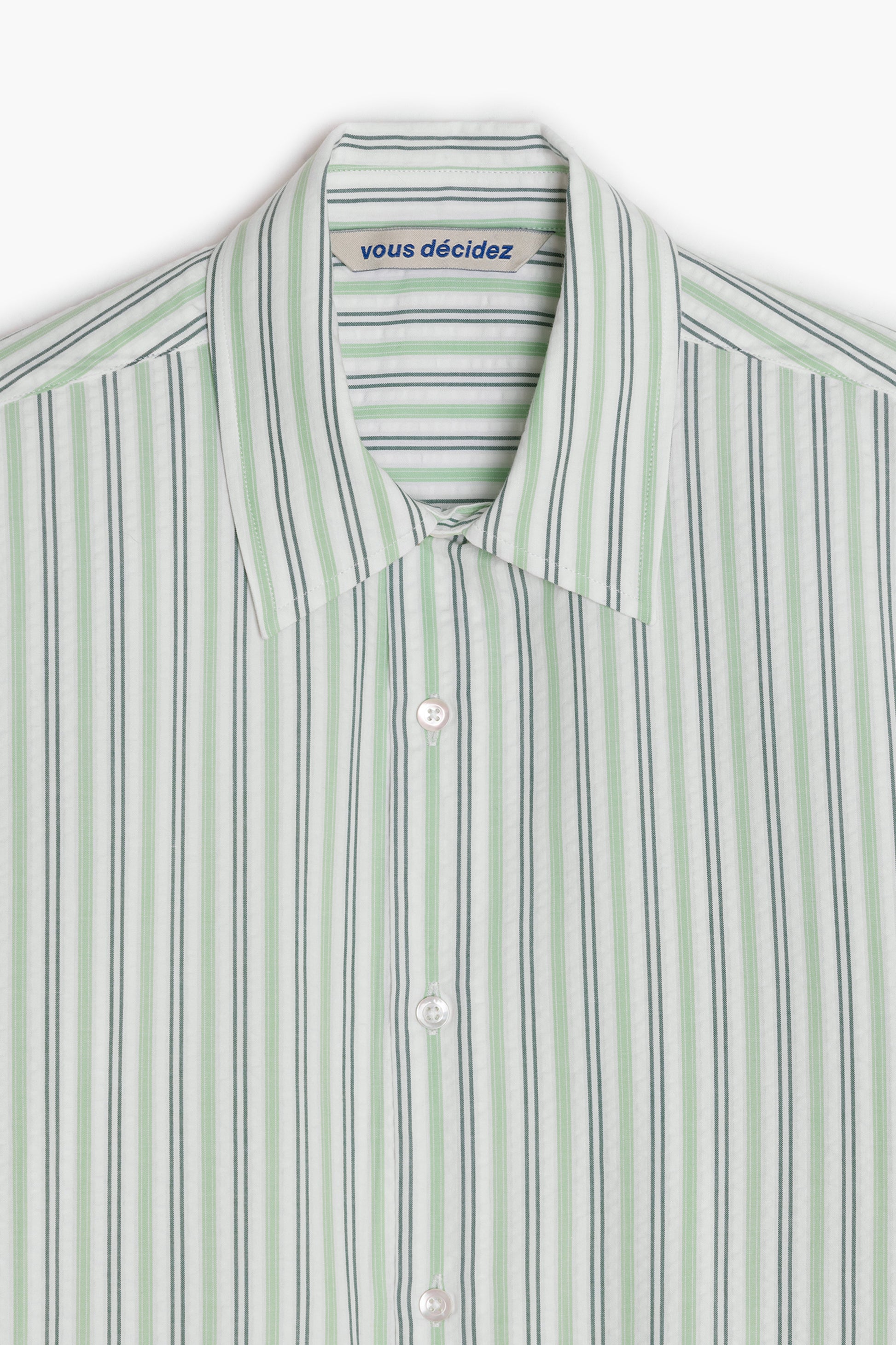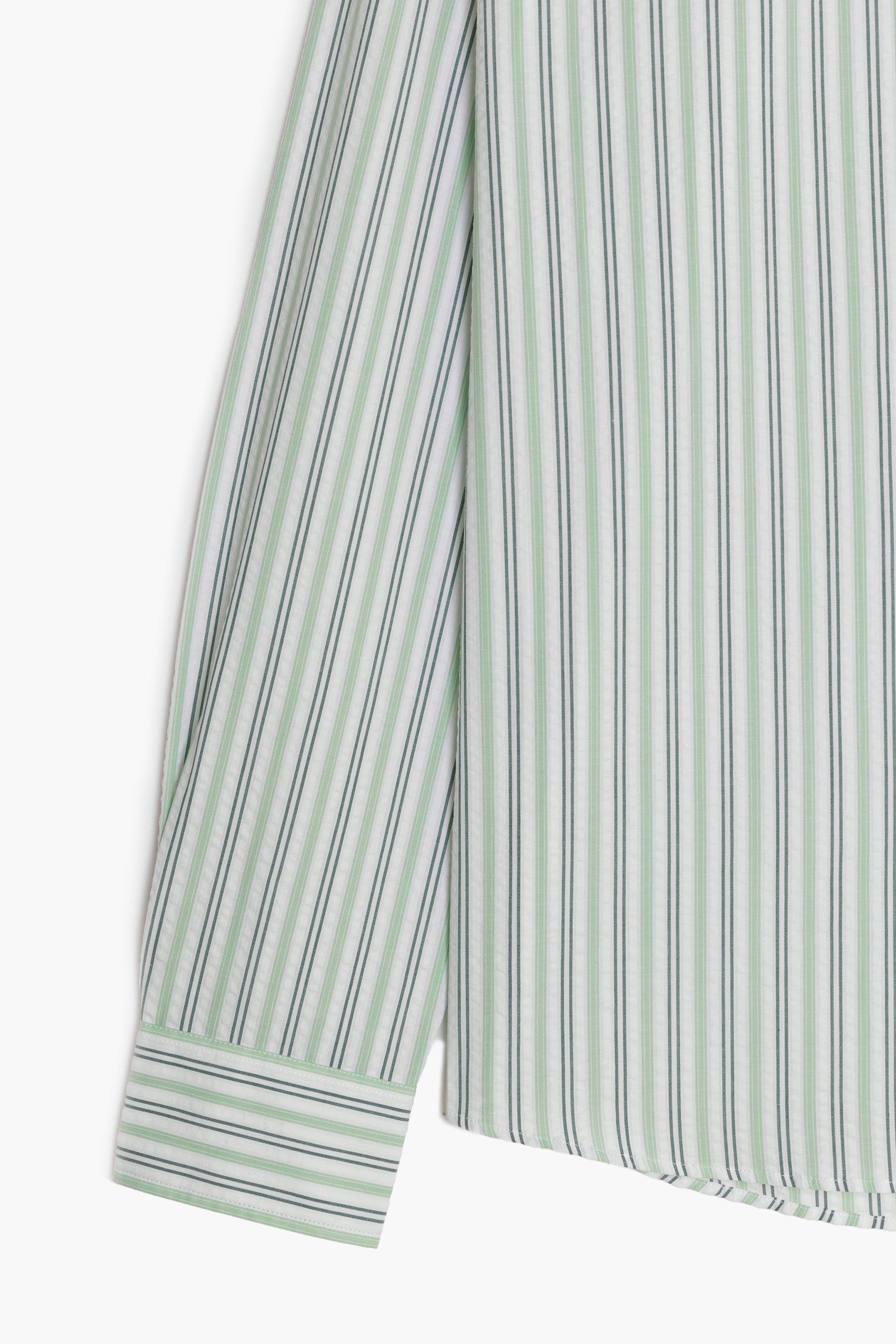 Made from lightweight 135 g/m² seersucker, this shirt uses deadstock fabric with green and white stripes. Its slightly embossed surface adds texture and structure while promoting breathability.