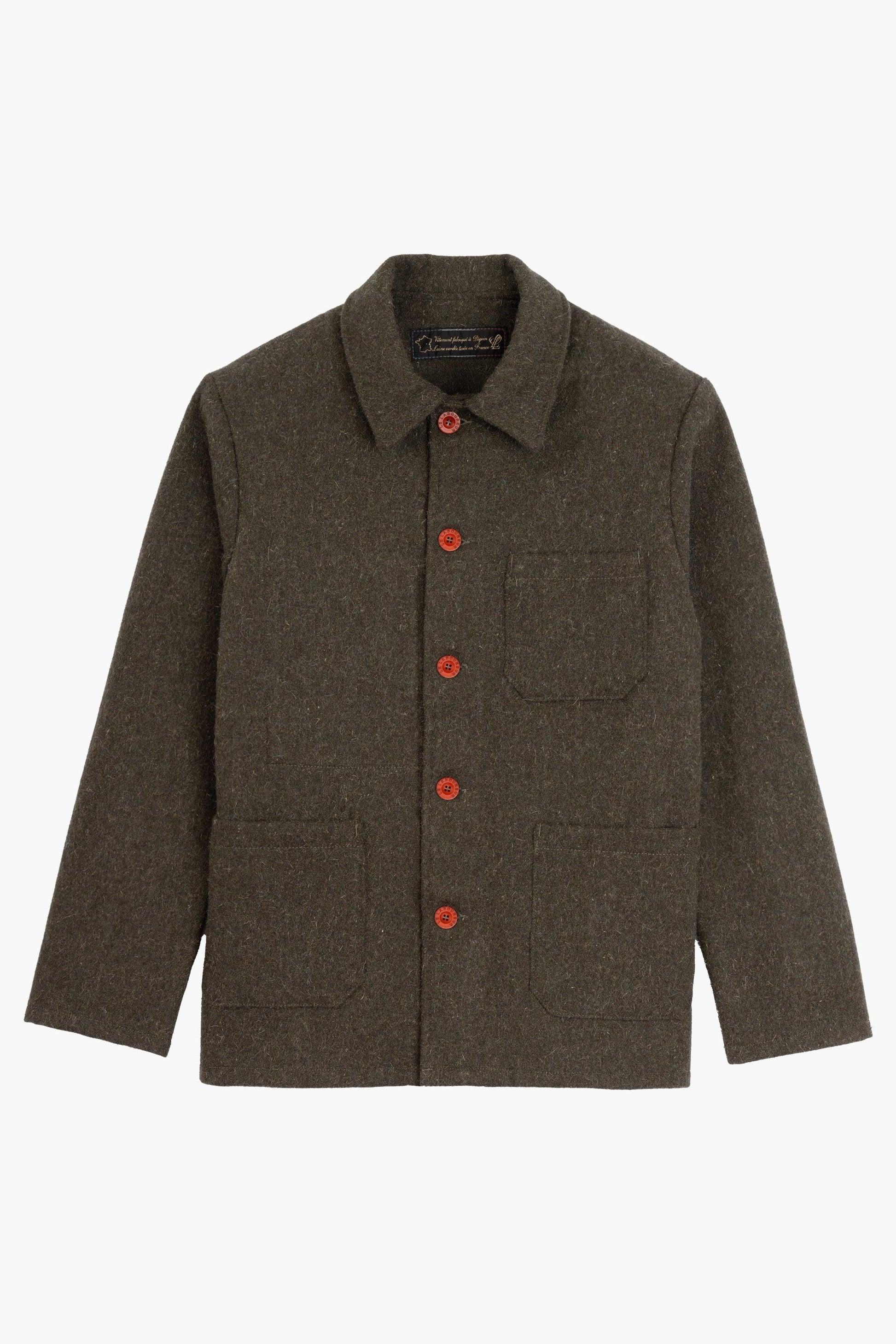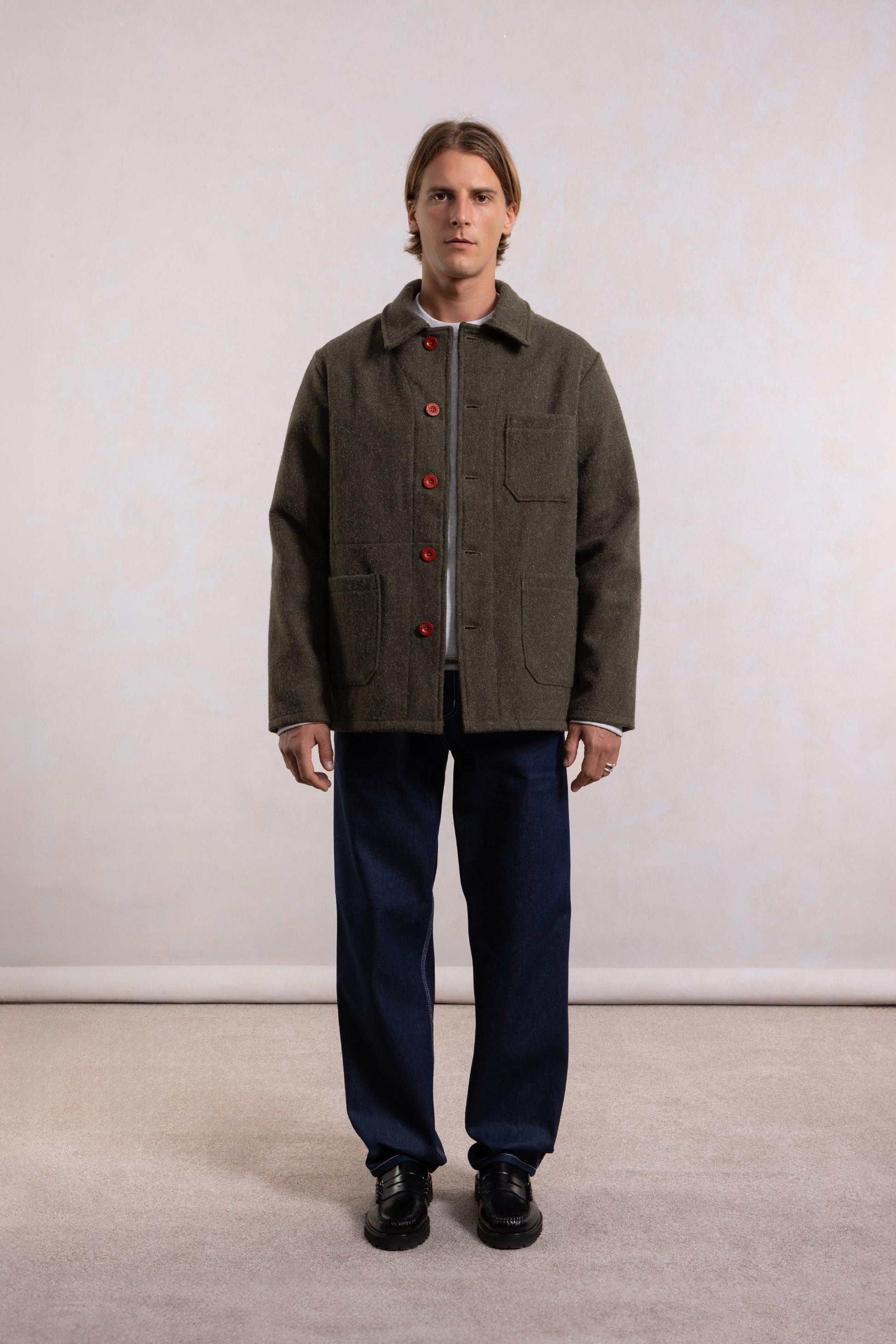 A timeless piece of wardrobe, the work jacket, or “coltin”, crosses the decades with style. Here revisited in khaki wool carded and woven in France. Its vintage allure and modernized cut make it an easy everyday essential.