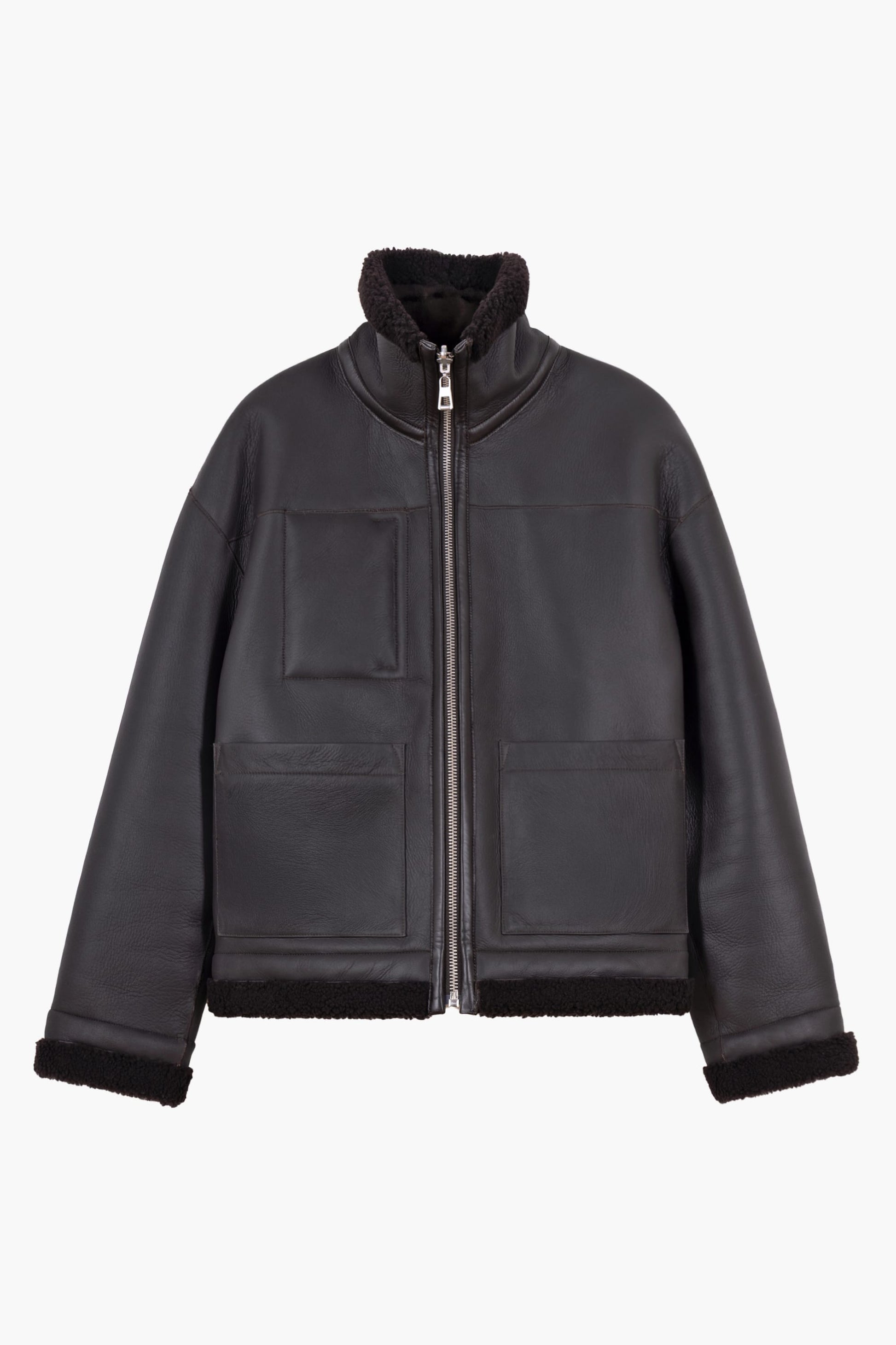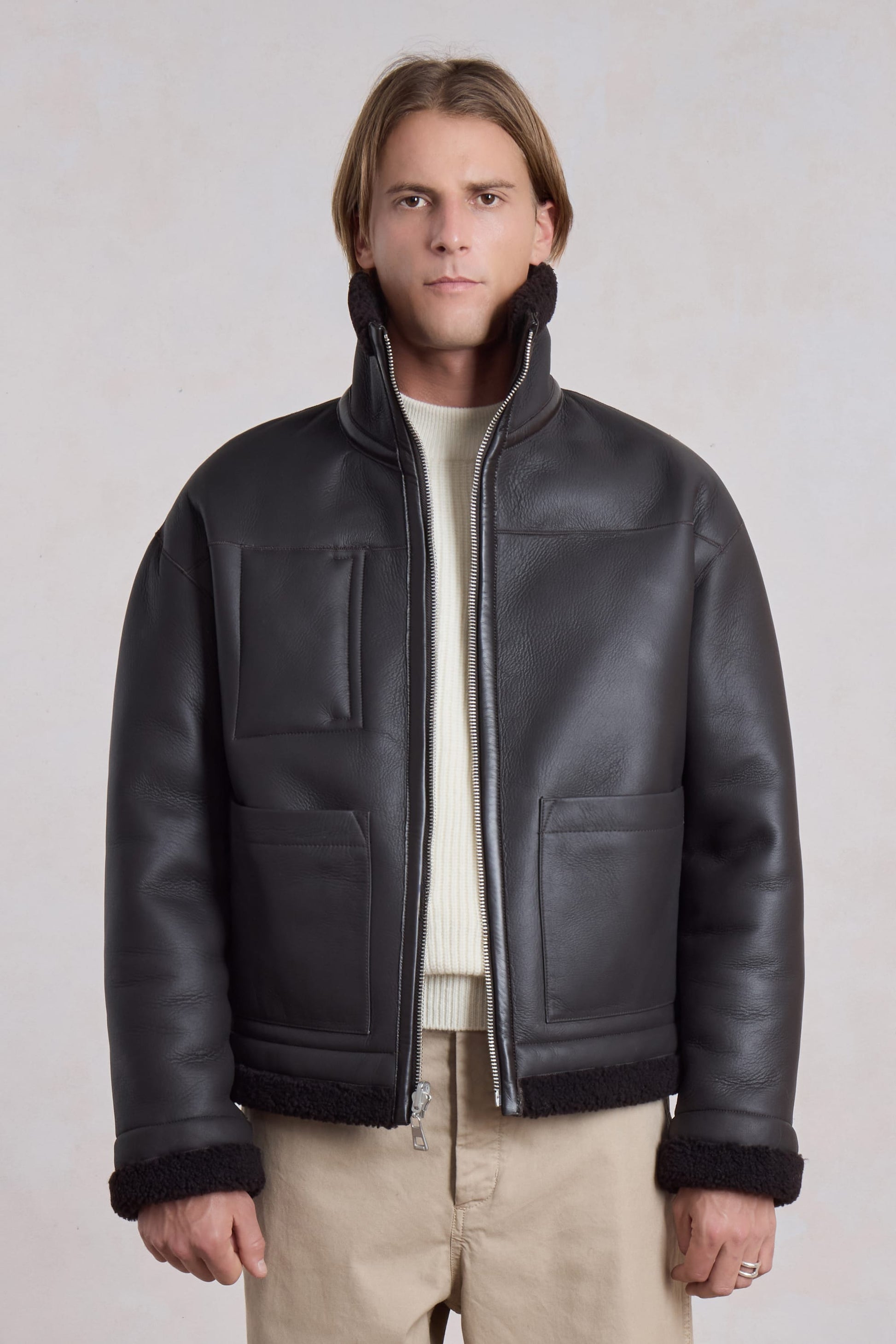 Côté peau : une veste en cuir souple d'inspiration bombardier avec poches plaquées et revers au col, à la taille et aux poignets en shearling.