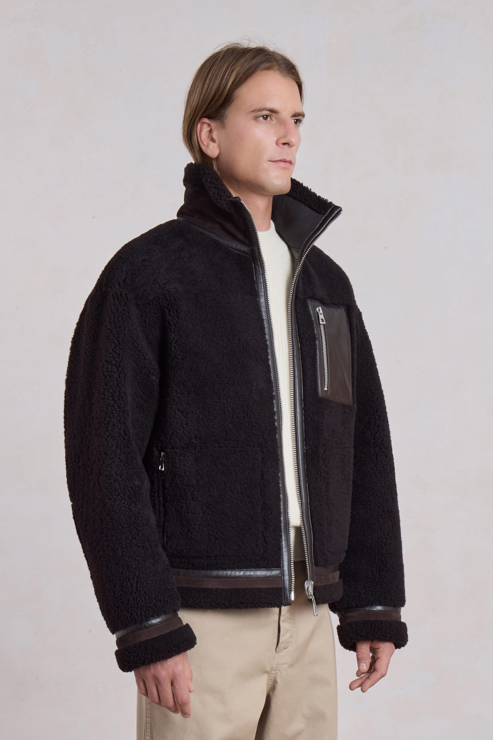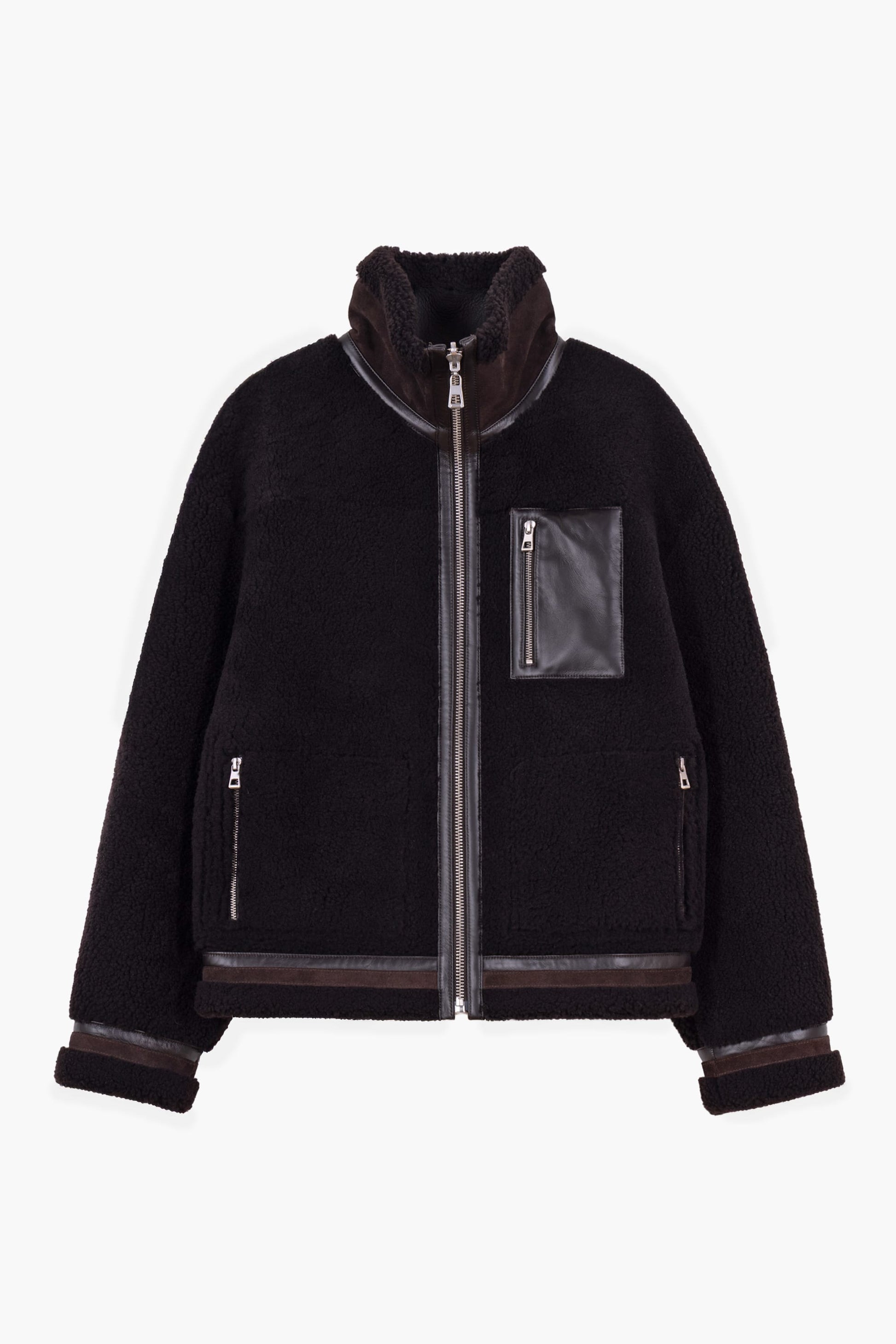 Côté shearling : une veste d'inspiration outdoor avec son col en suède, ses poches latérales et poche poitrine zippée en cuir nappa.