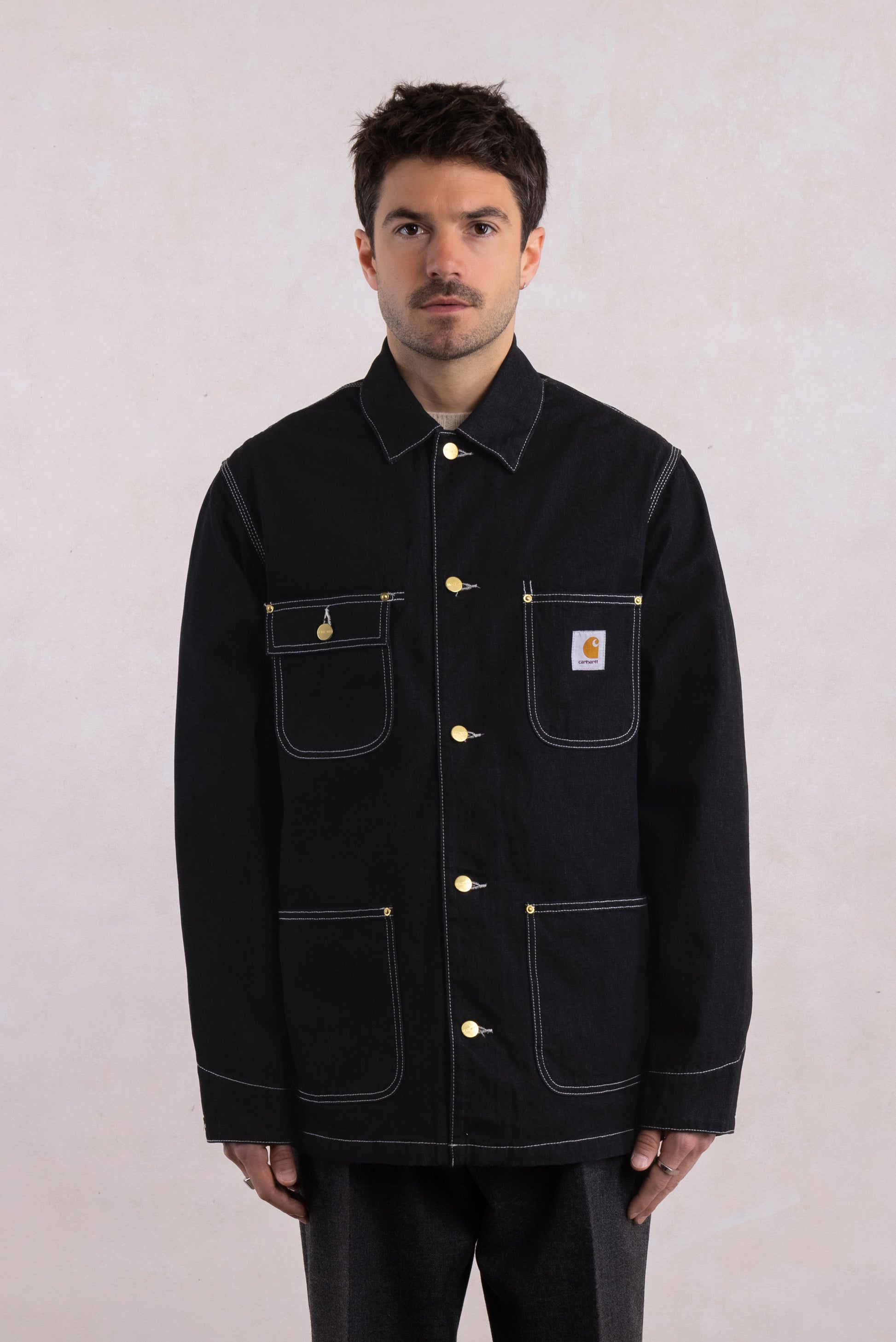 Carhartt WIP's iconische Norco Denim: 100% katoen, 380 g/m² Contrasterende stiksels Verstelbare manchetten Knoopsluiting Ongevoerd Vierkant label op borstzak Carhartt WIP referentie: OG Chore Coat Kleur: Zwart, één wassing