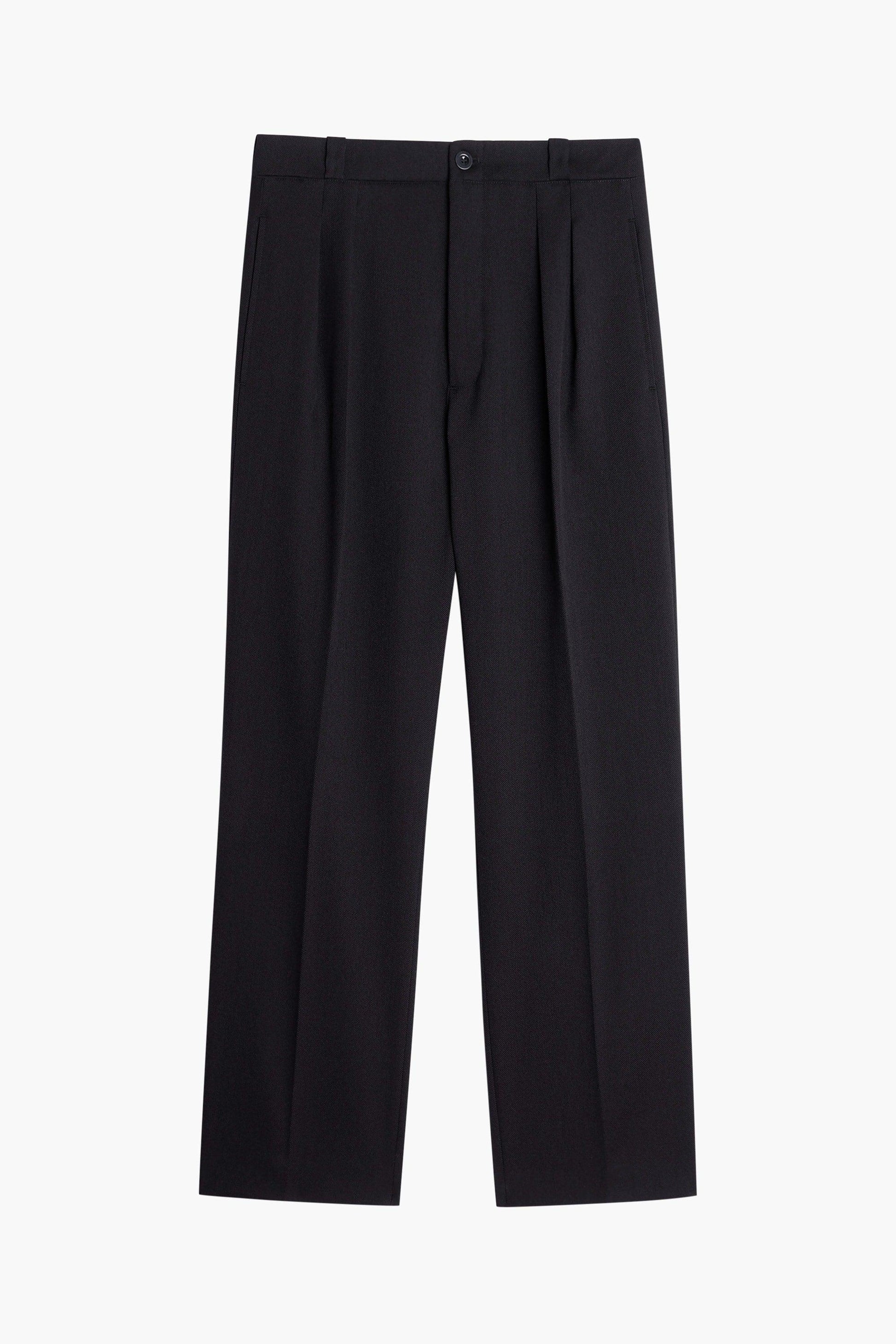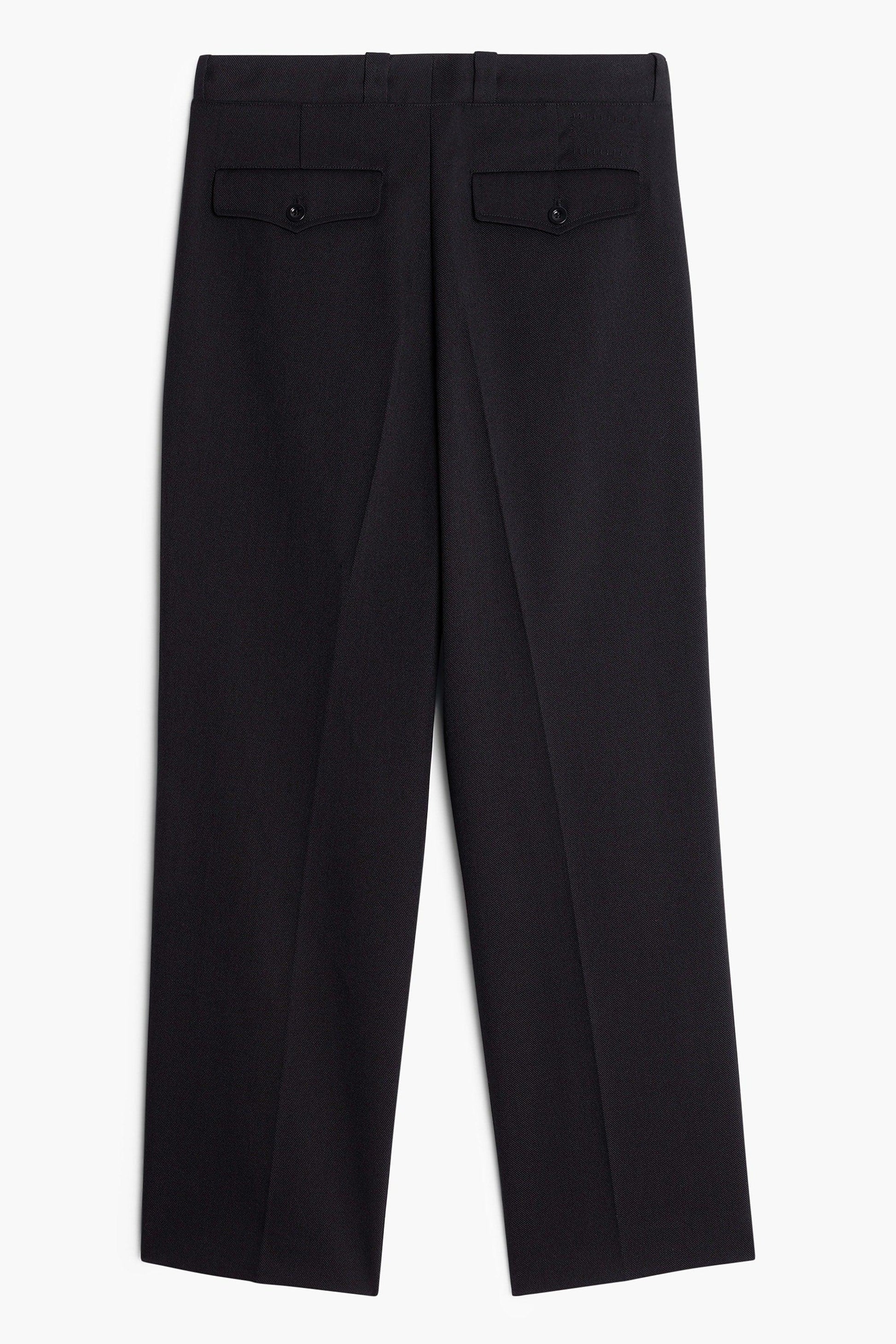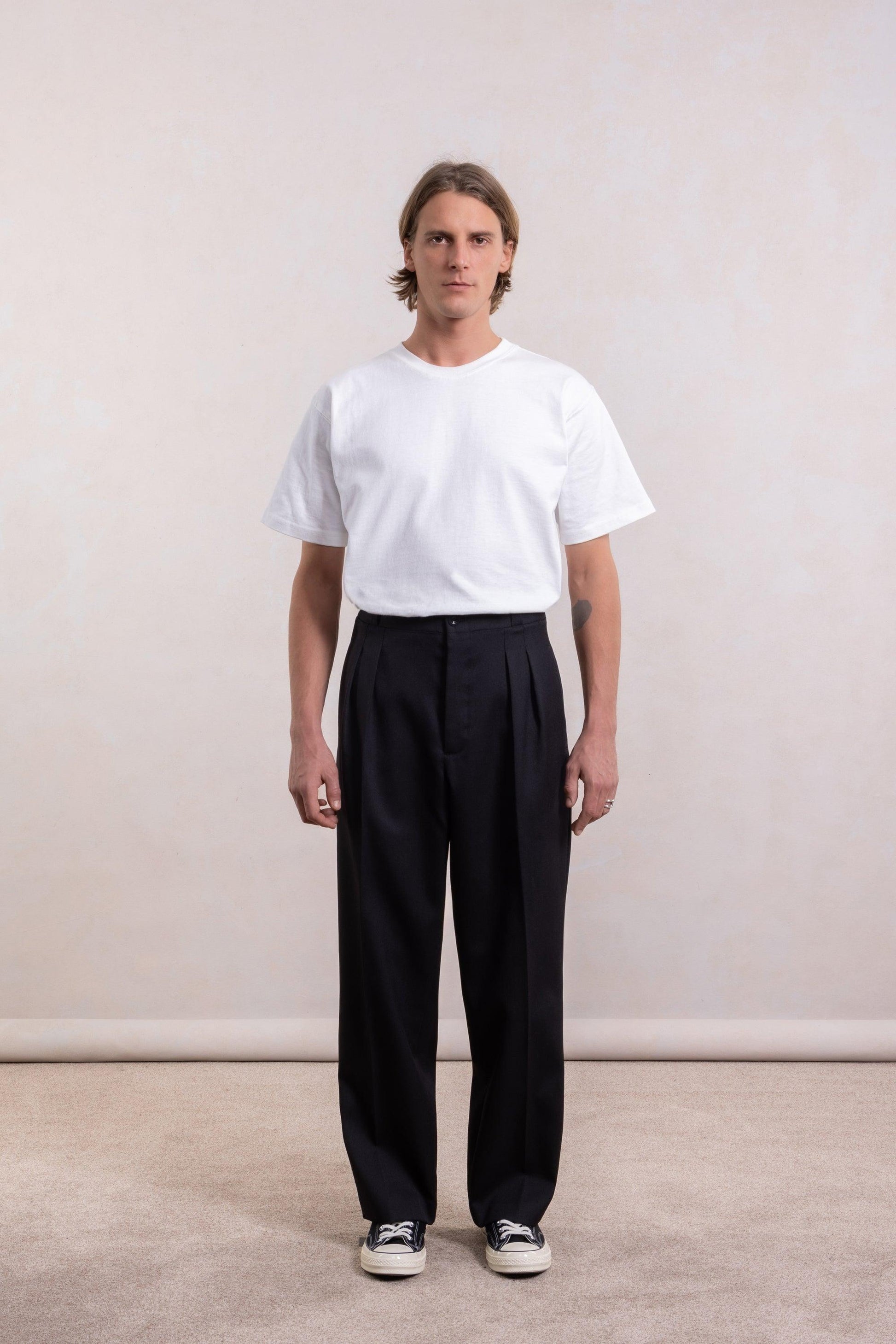 These straight-leg black wool twill pants are inspired by the pants worn by the French Foreign Legion in the 1950s. Their luxurious fabric, straight cut, and double pleats give them a unique drape and feel.
