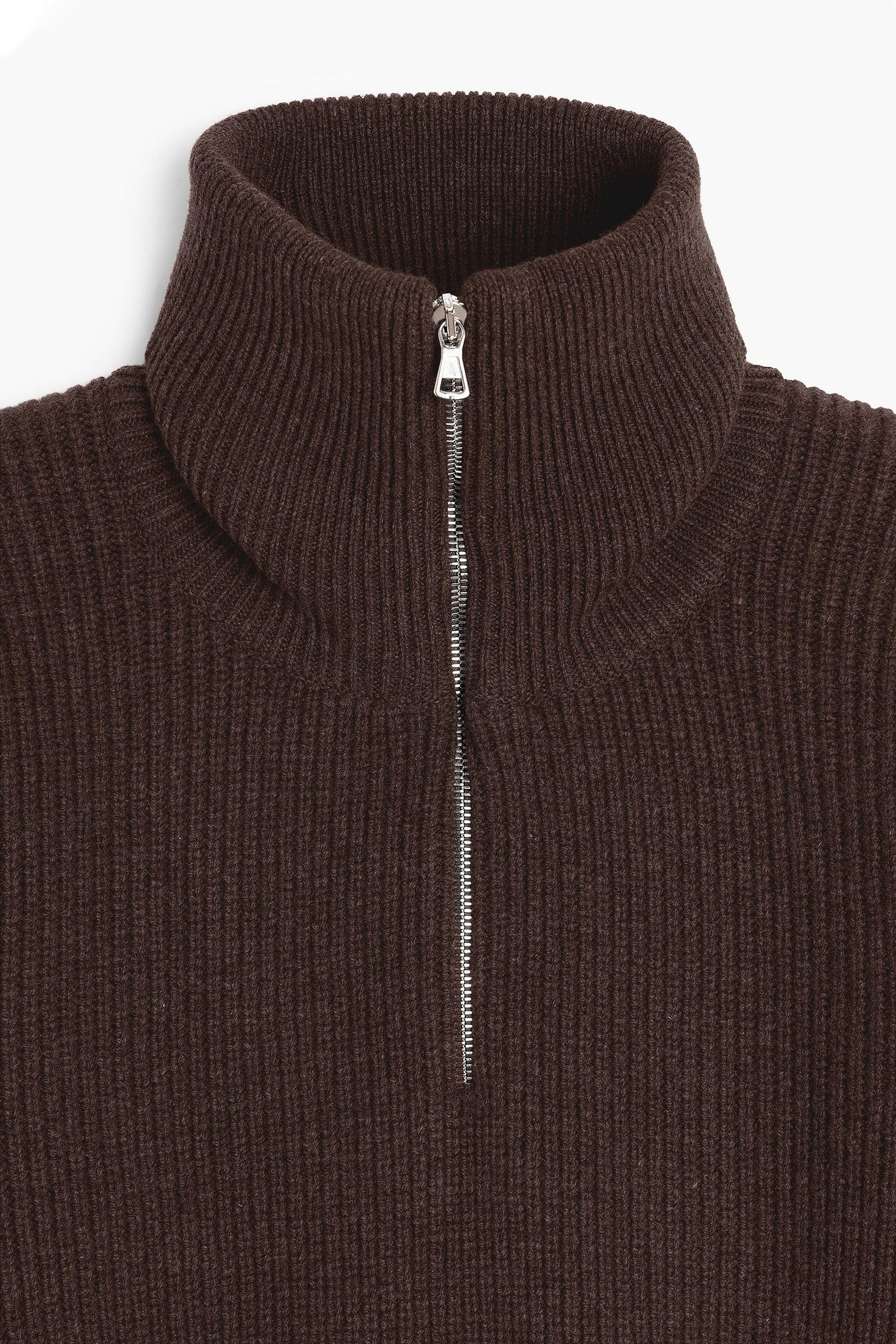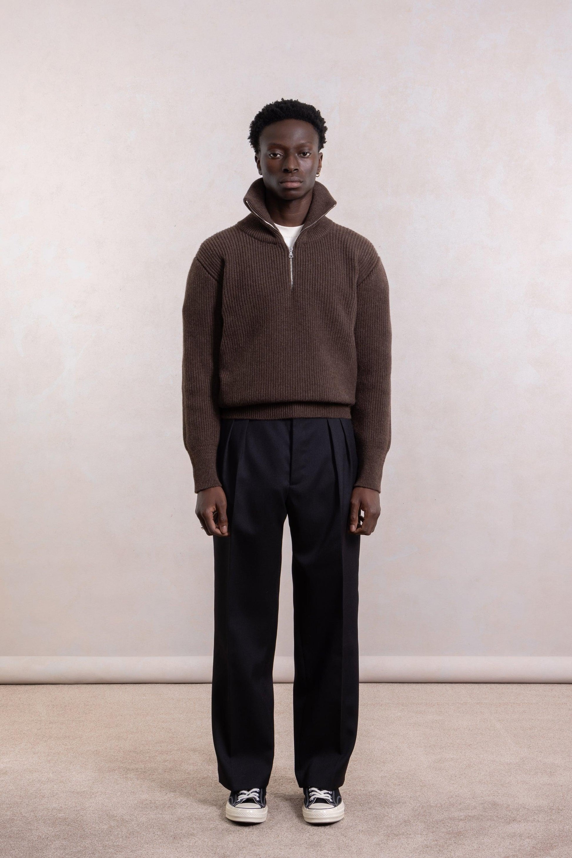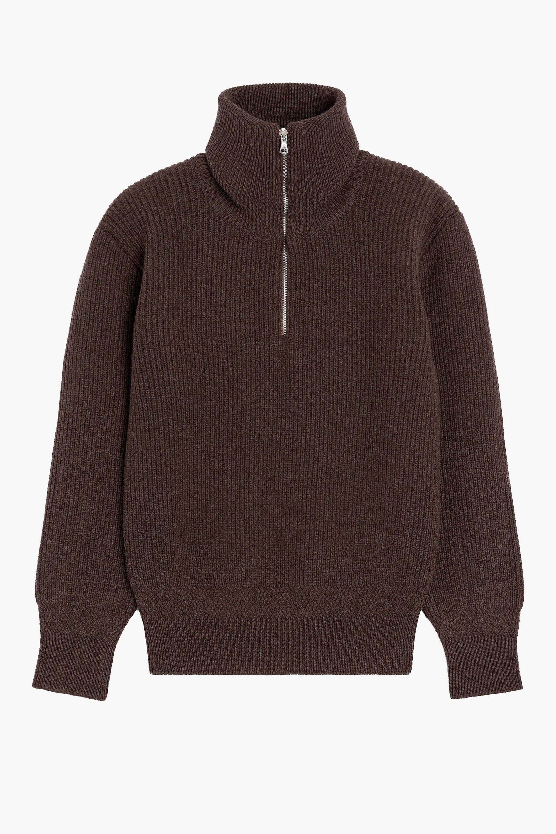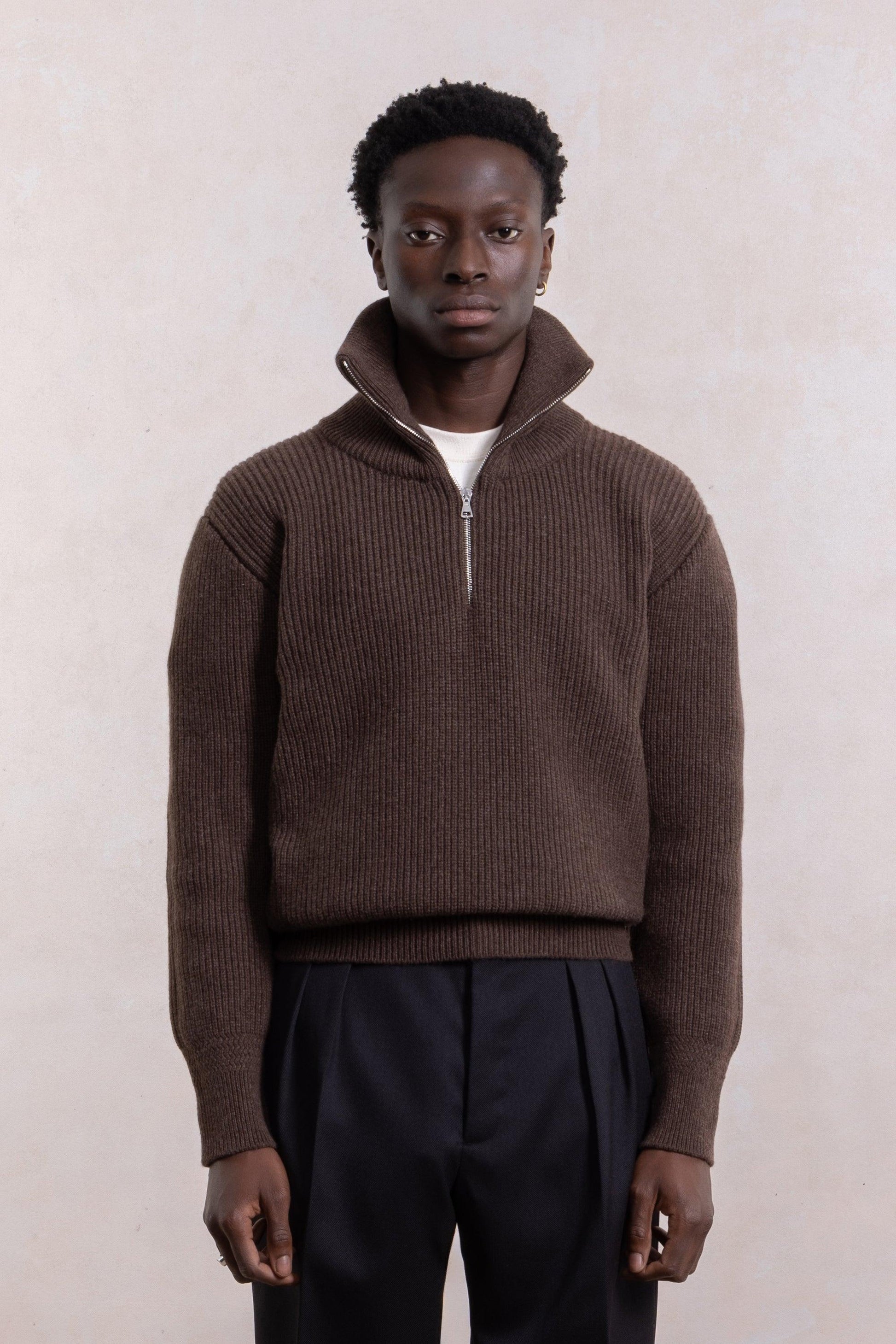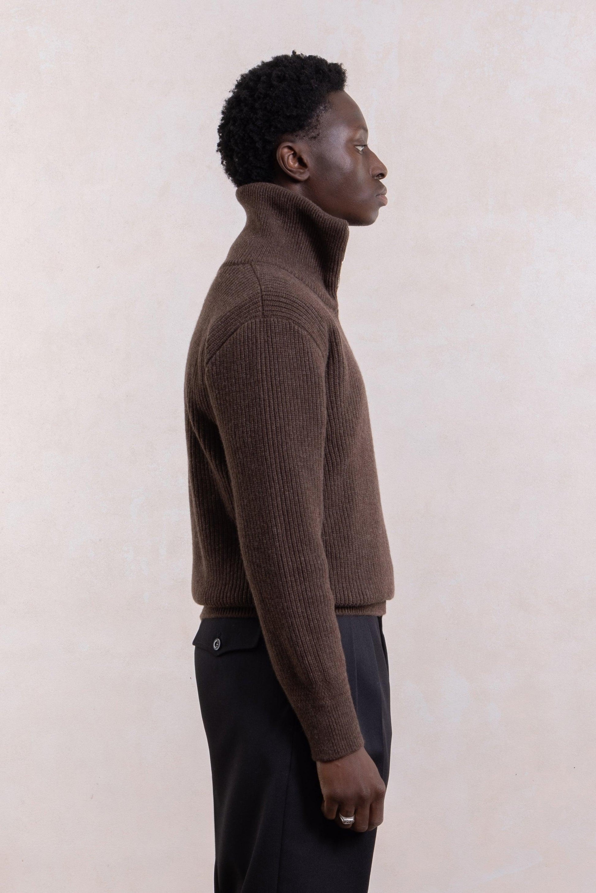 Zachte en warme lamswol: 100% RWS-gecertificeerde merinowol (herkomst: Australië) Spinnerij: Z. Hinchliffe & Sons (Verenigd Koninkrijk) Gebreid door: W. Lockie (Schotland) Engelse ribbelsteek - 4 draden Hoge kraag met ritssluiting Zilverkleurige RIRI-ritssluiting Brede ribboorden aan de onderkant en manchetten met onregelmatige ribbelsteek Kleur: bruin Museum Garments-referentie: SAILOR SWEATOR