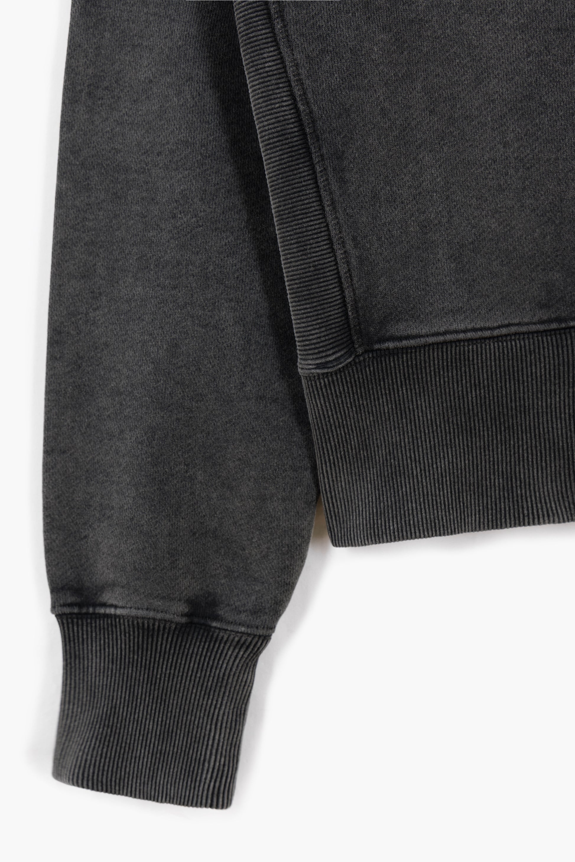 Son traitement de délavage, obtenu par oxydation avec un abrasif naturel, vient estomper les teintes pour créer un effet fade out authentique, évoquant la patine subtile des sweats vintage. Les bords-côtes placés au col, aux poignets, à la taille et sur les côtés soulignent son allure affirmée, dans la lignée des sweatshirts universitaires des années 90.