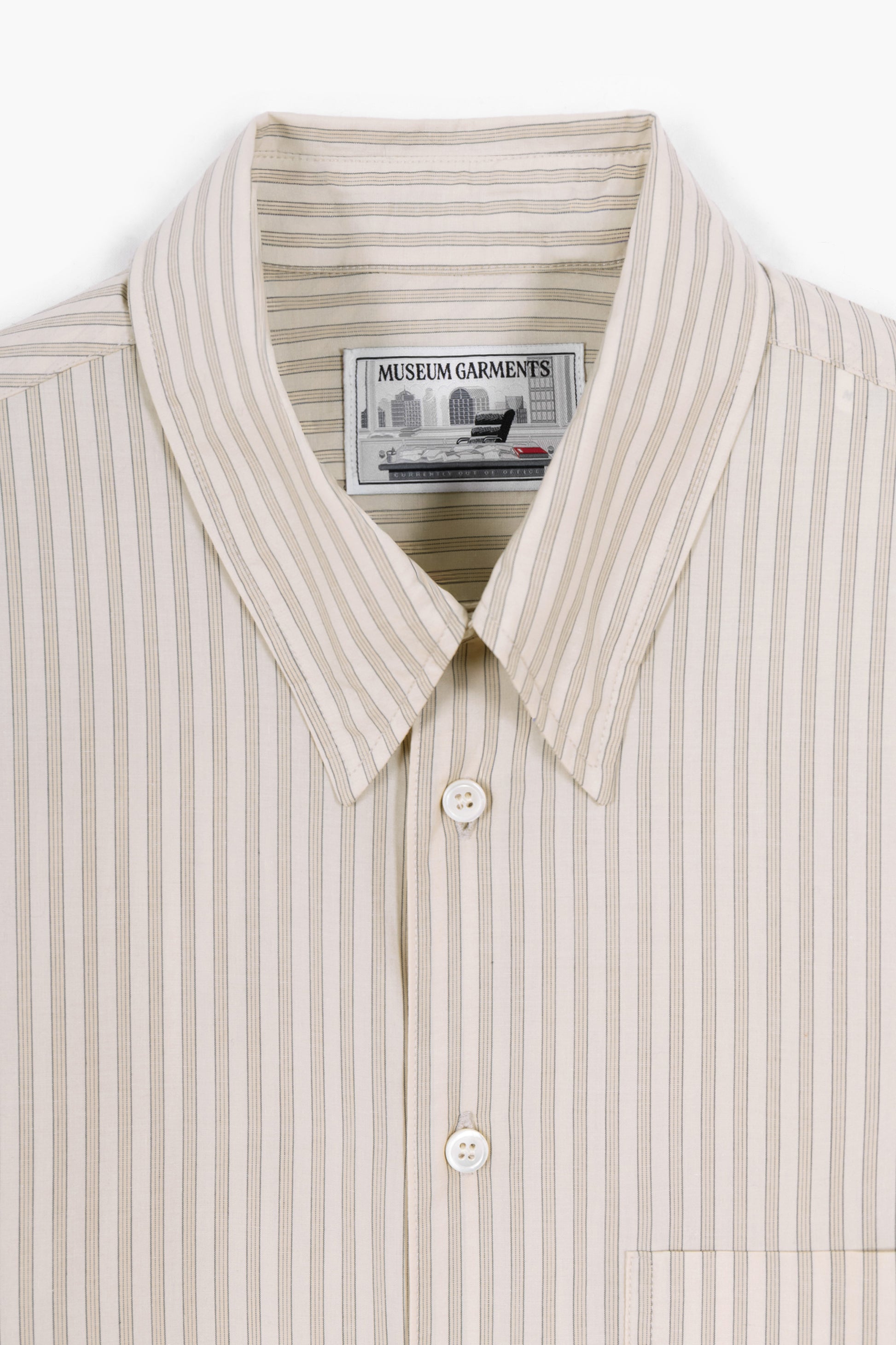 Sa coupe droite et son col à boutonnage caché lui confèrent une allure soignée et versatile. Au dos du col, une broderie ton-sur-ton cadre Museum Garments souligne la singularité de la pièce.