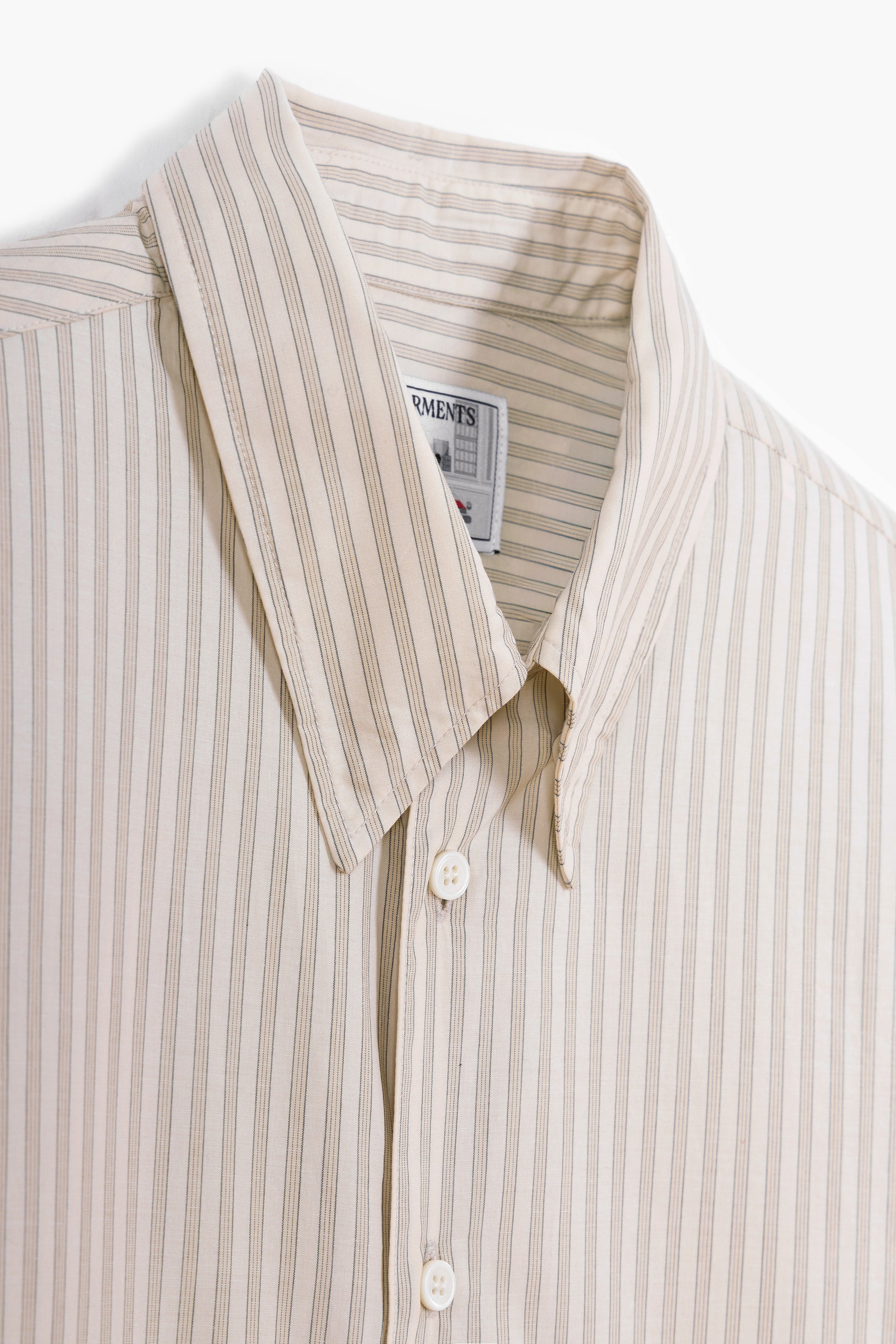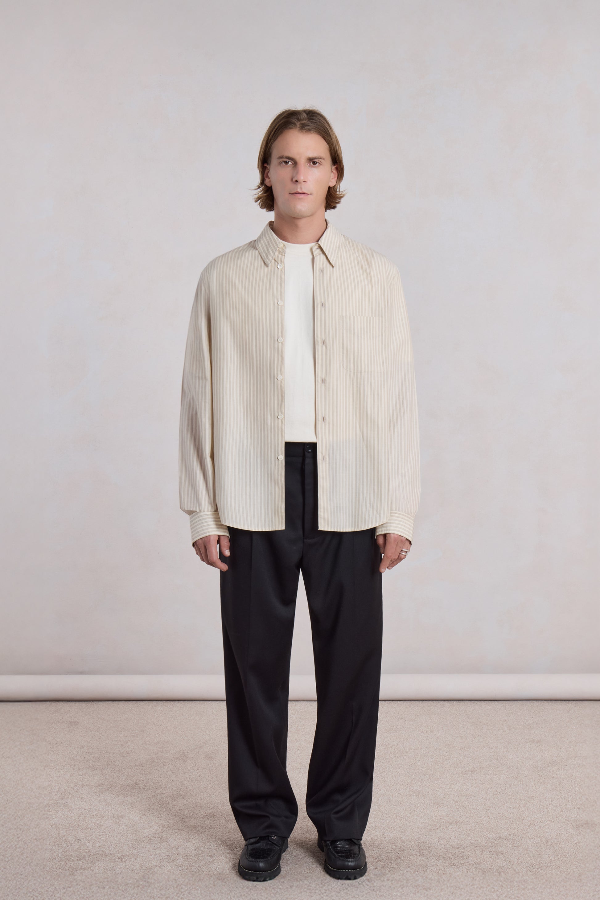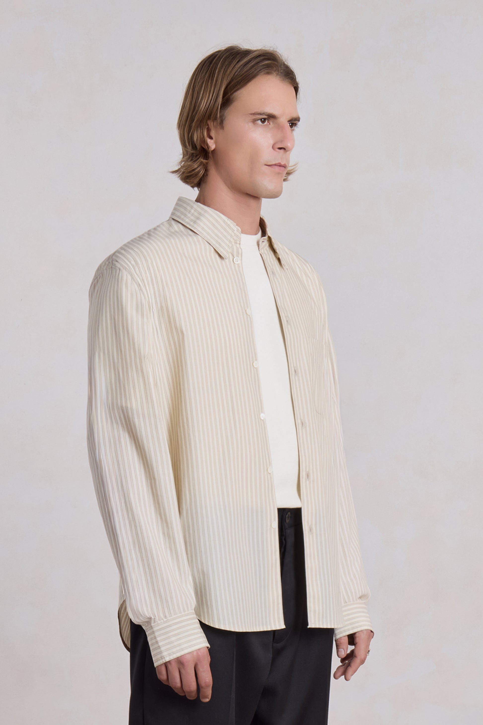 Inspirée par la chemise business traditionnelle et subtilement détournée vers un registre plus mode, la Corporate Shirt allie rigueur, sobriété et sens du détail. Confectionnée dans une popeline de coton japonaise rayée beige et blanche, elle se distingue par sa main nette, fraîche et légère.