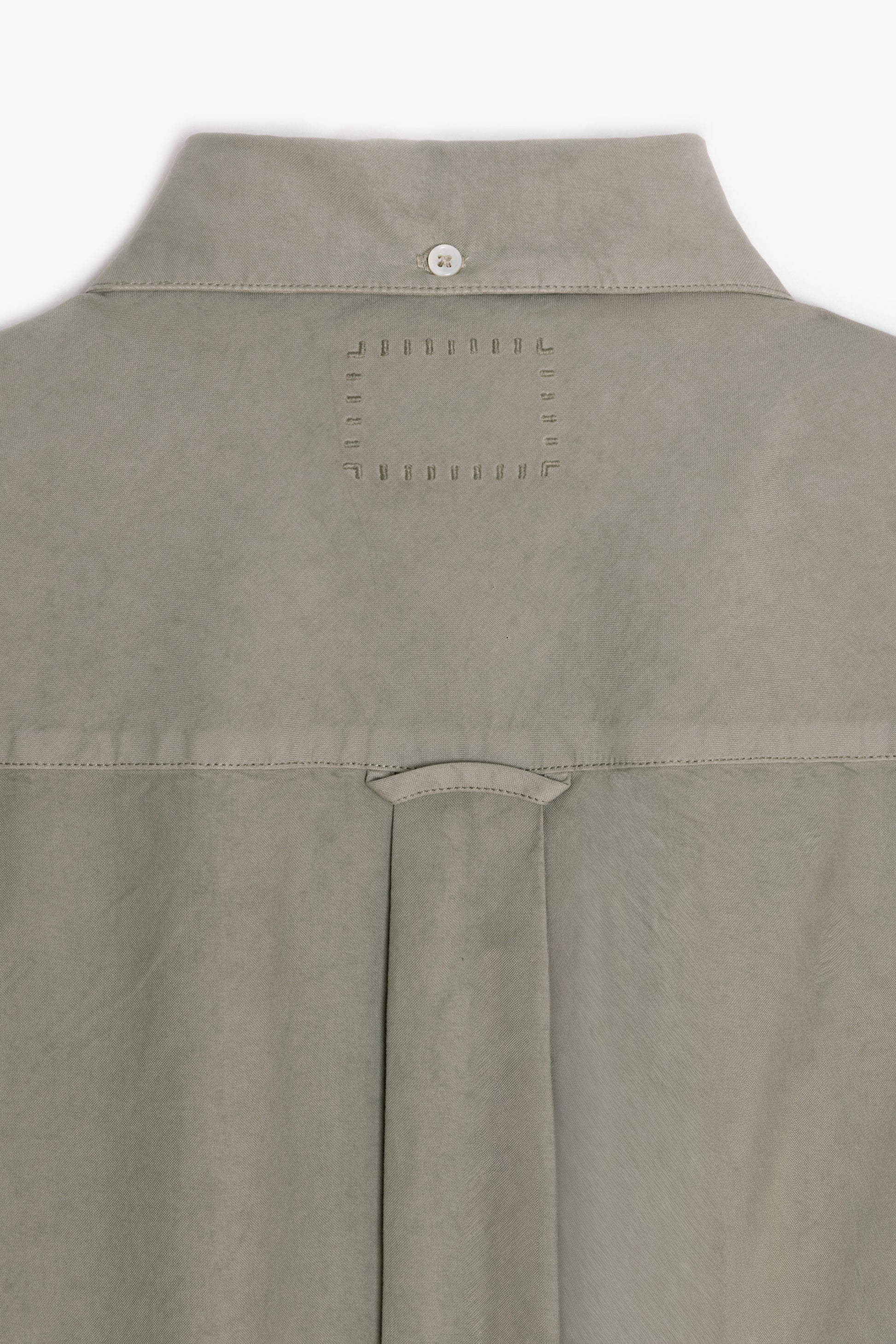 Le coloris sauge apporte une douceur naturelle et une grande polyvalence, tandis que les boutons en nacre naturelle et la broderie Museum Garments ton-sur-ton au dos du col signent la pièce avec discrétion.