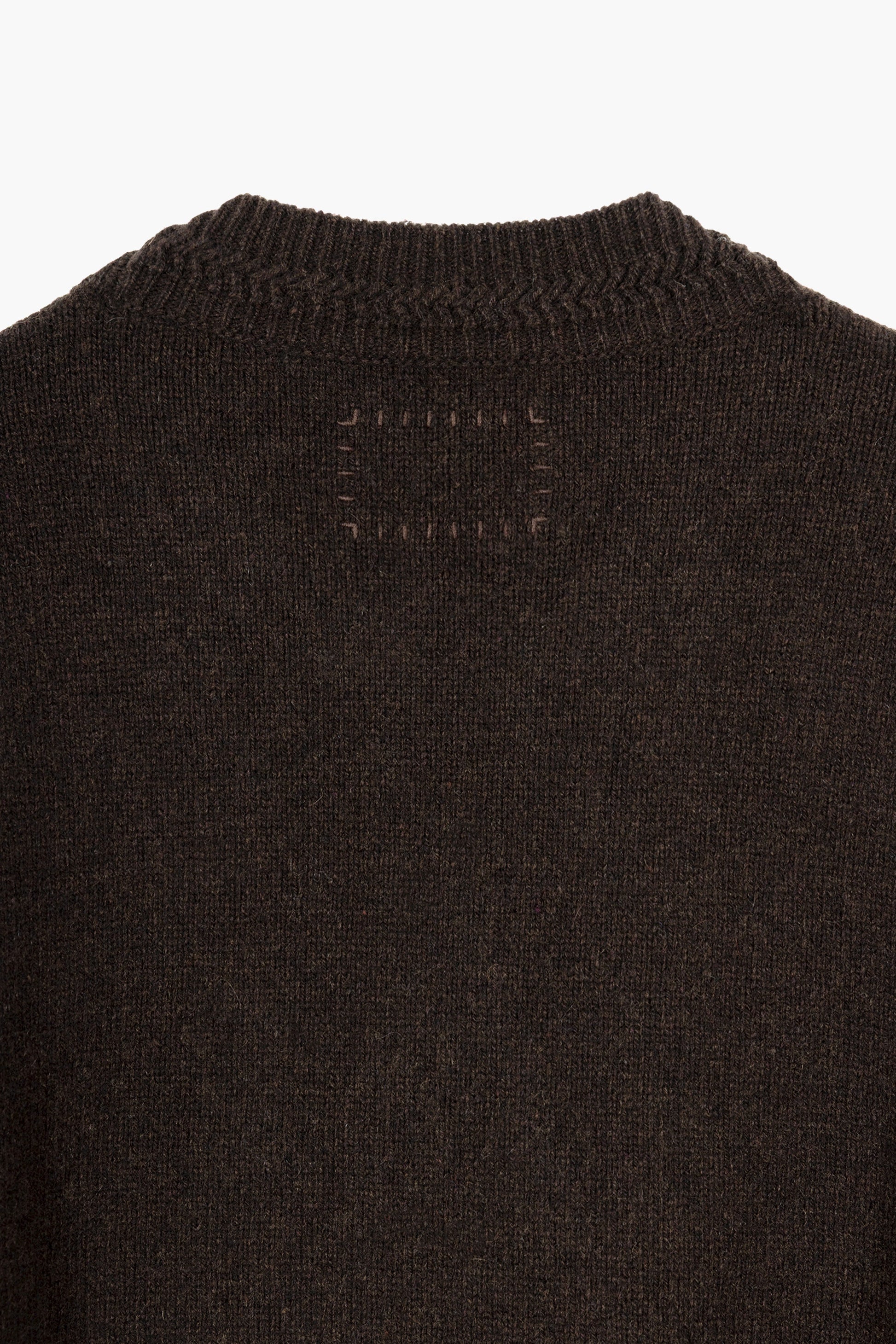 Réinterprétation du pull en cachemire classique, il se distingue par des proportions généreuses et une coupe relaxed. Son col rond près du cou et ses bords-côtes travaillés avec des détails irréguliers lui donnent un caractère affirmé et singulier.