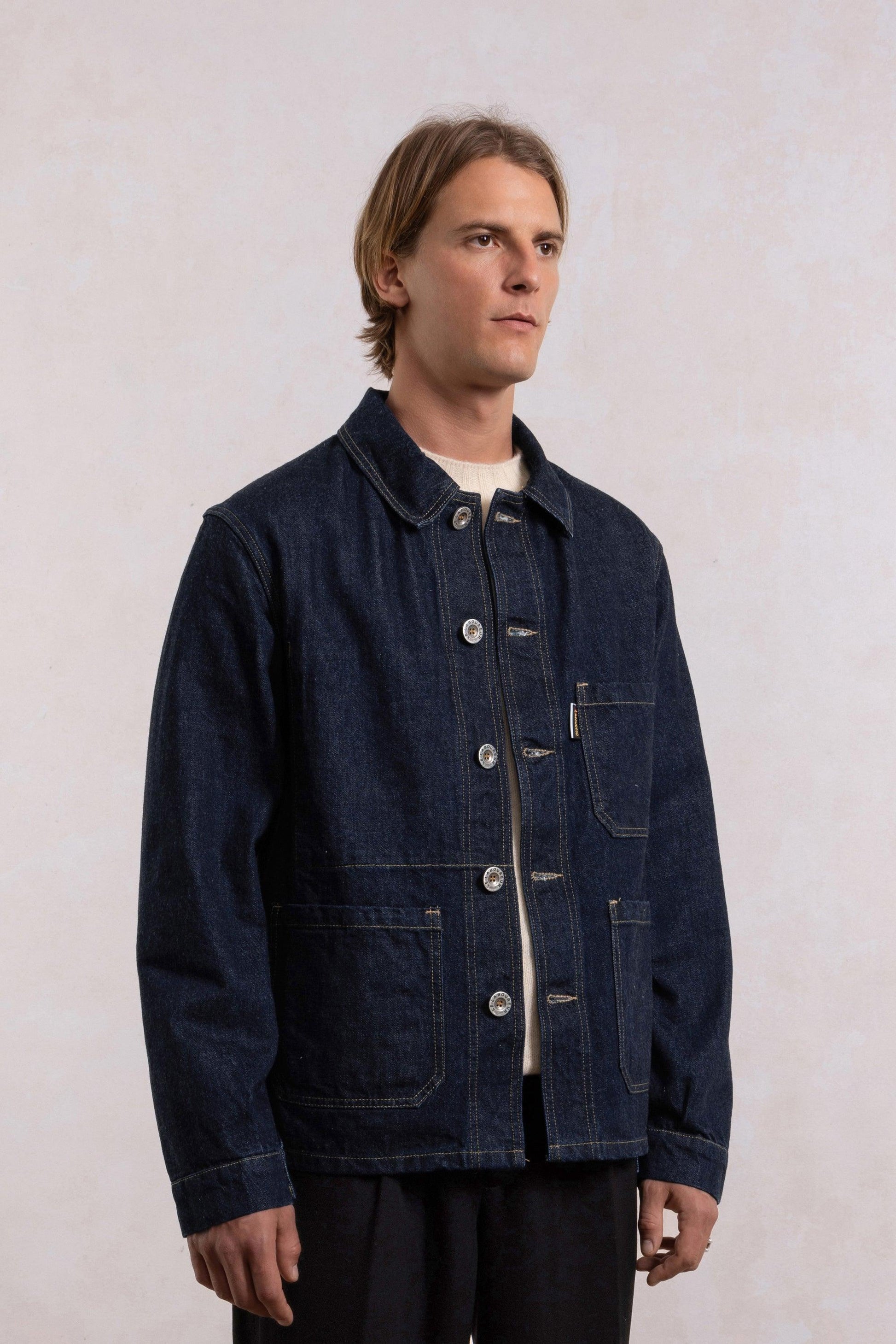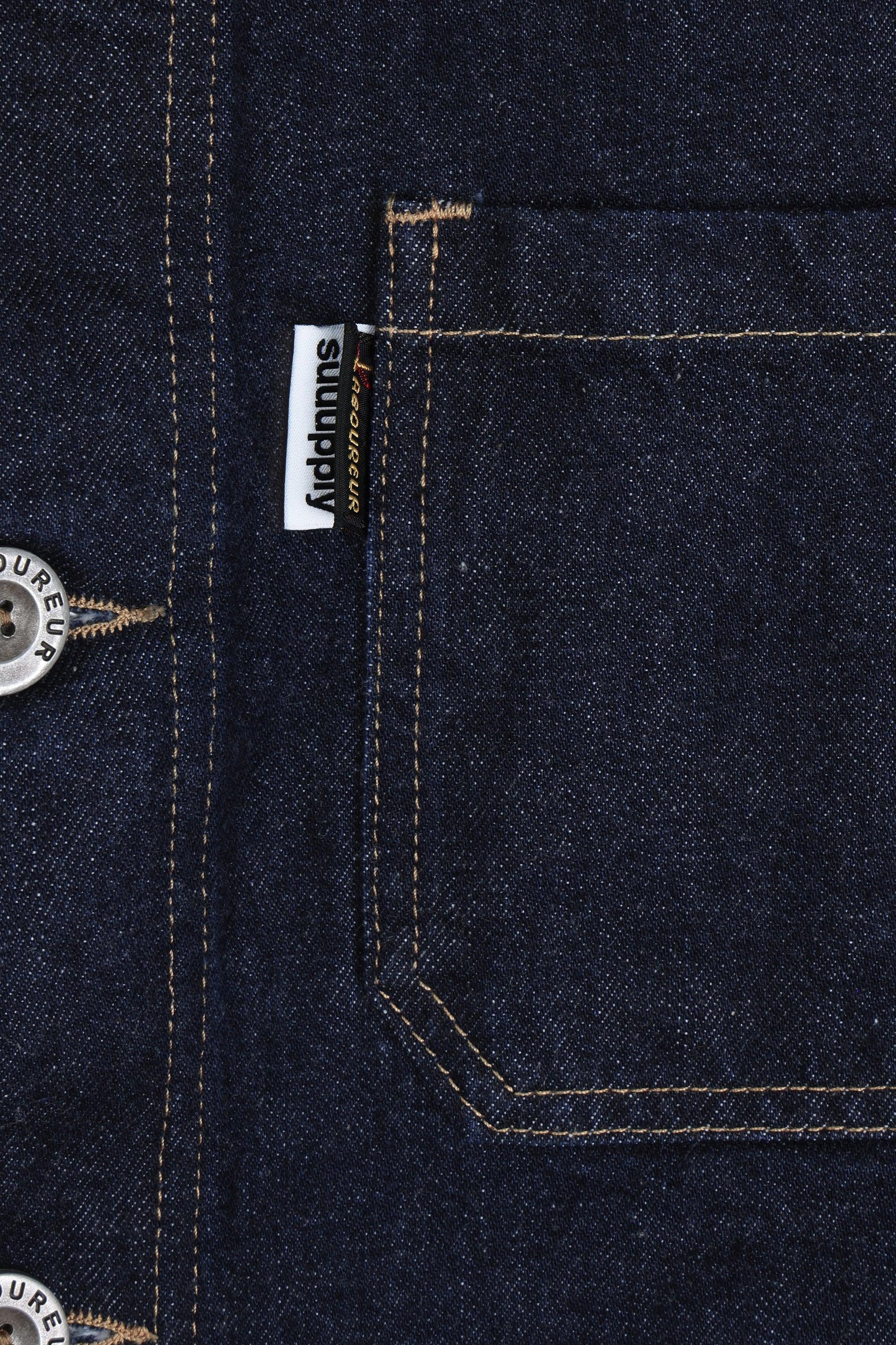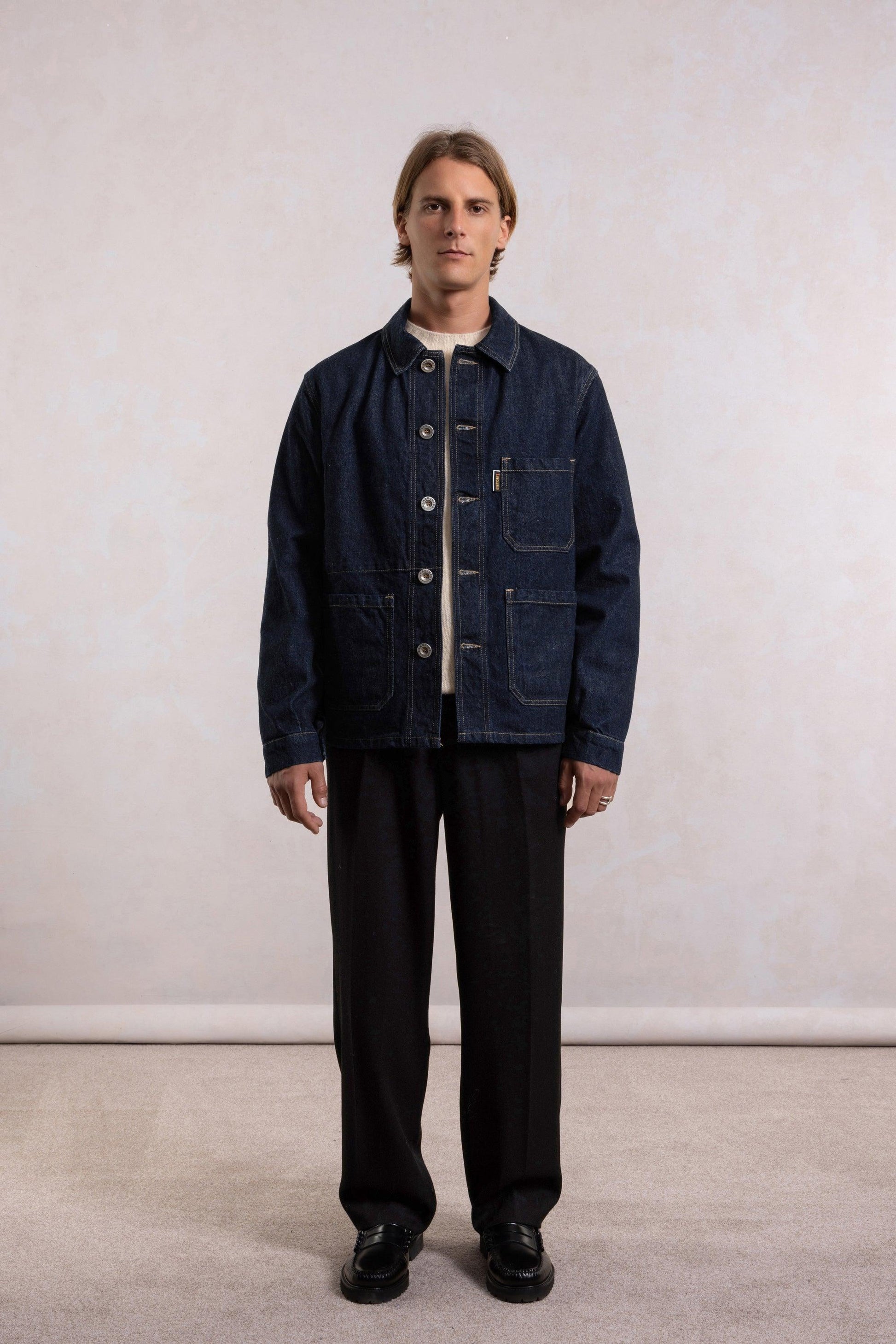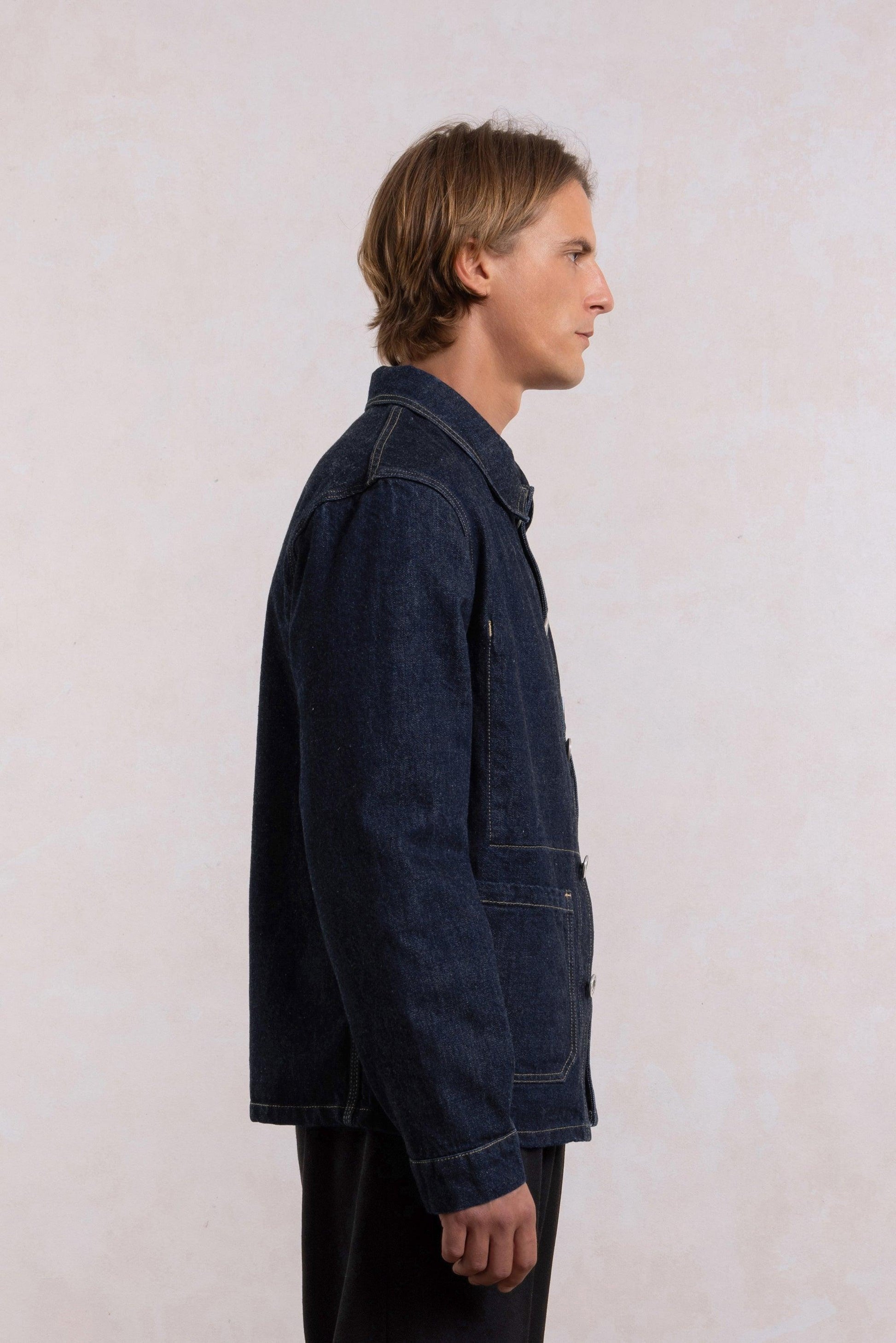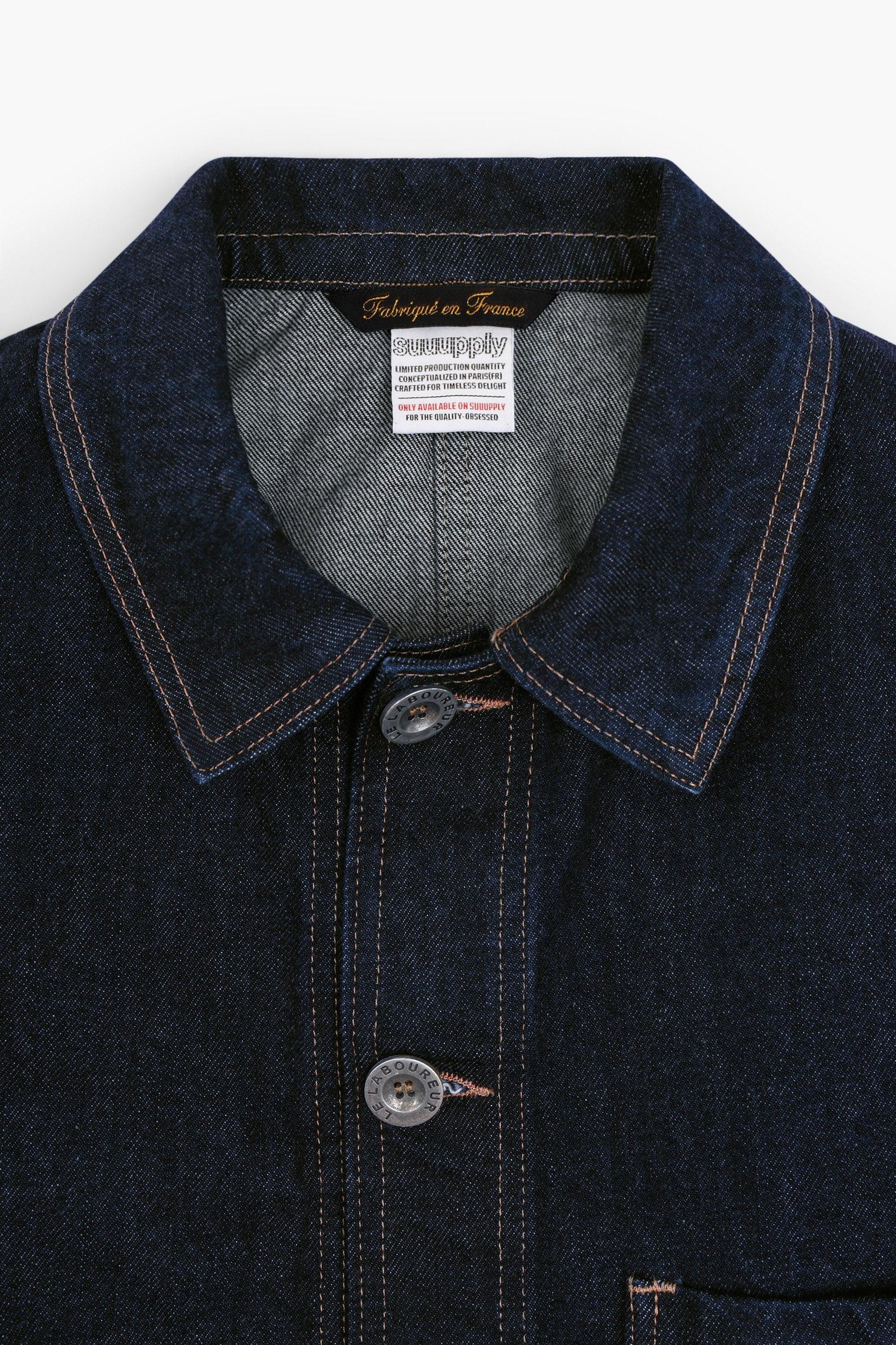 Pour cette première collaboration exclusive avec suuupply, son modèle emblématique se décline dans un denim japonais bio (13,5 oz), avec une coupe modernisée : épaules légèrement plus amples, longueur raccourcie et poches intérieures ajoutées.
