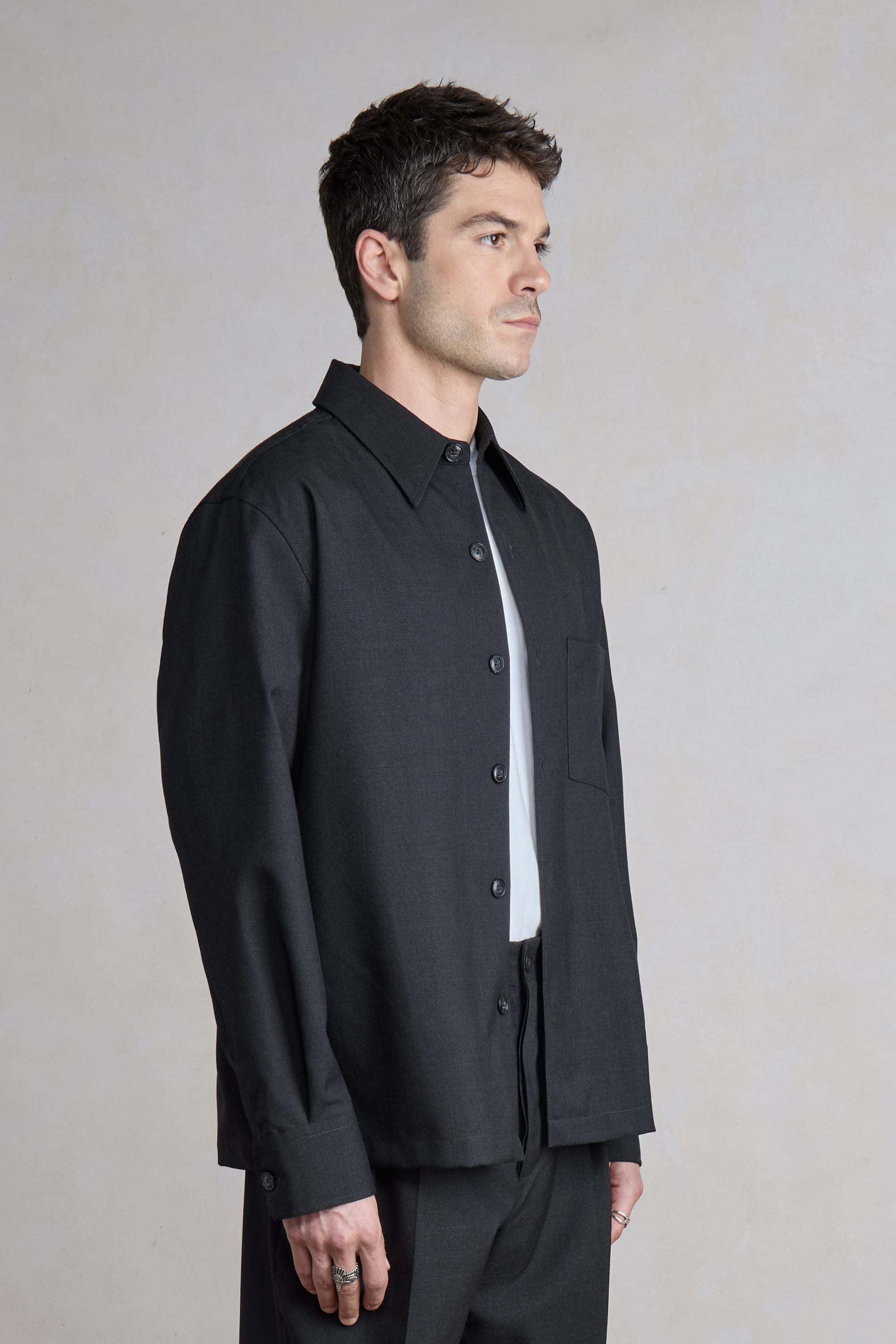 La Western Overshirt revisite le vêtement utilitaire en y intégrant les codes du tailoring, faisant dialoguer fonctionnalité brute et précision plus raffinée. Ses poignets pointus, son empiècement western et ses poches poitrine empruntent au workwear, tout en étant repensés pour un usage contemporain.